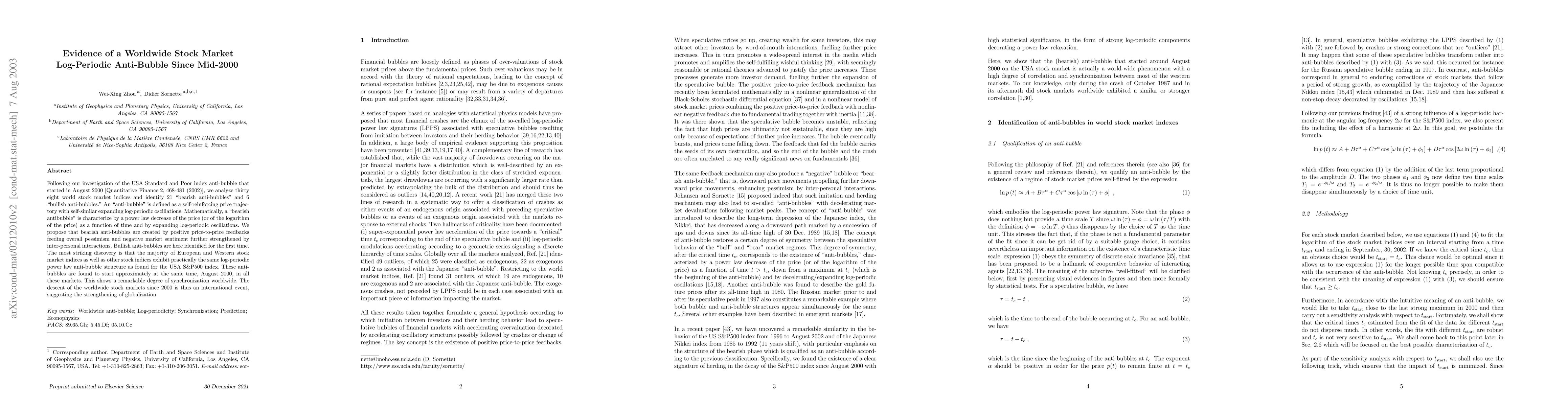 A global stock market anti-bubble was identified, starting in August 2000, with 21 international indices exhibiting similar log-periodic power law structures, indicating a synchronized worldwide economic downturn.