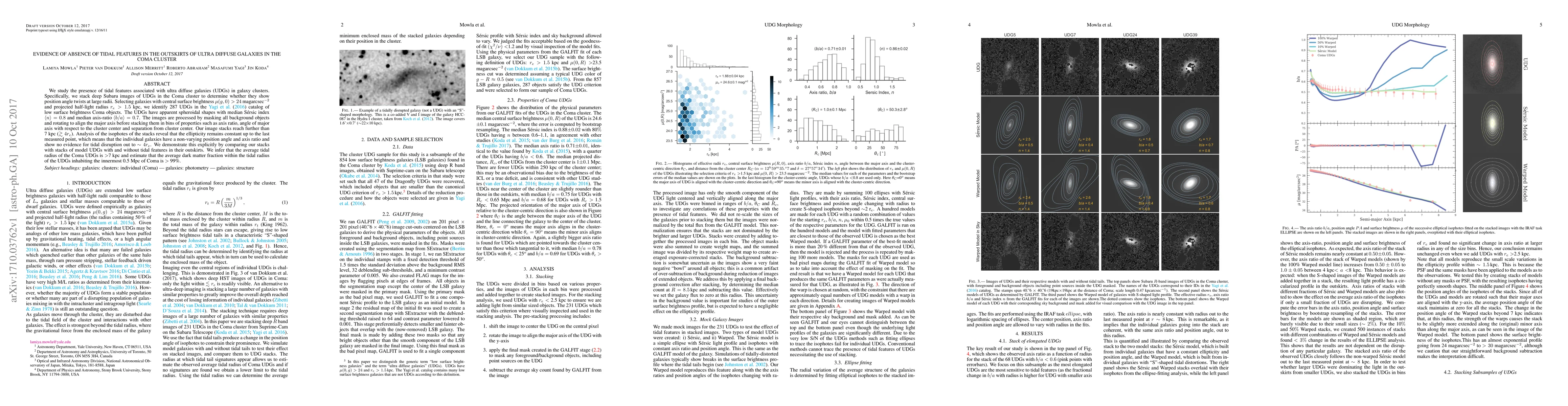 This paper investigates the presence of tidal features in ultra diffuse galaxies (UDGs) in the Coma cluster using deep Subaru images. The analysis reveals no evidence of tidal disruption in UDGs out to 7 kpc, indicating a stable, spheroidal shape and suggesting a high dark matter fraction within the tidal radius.