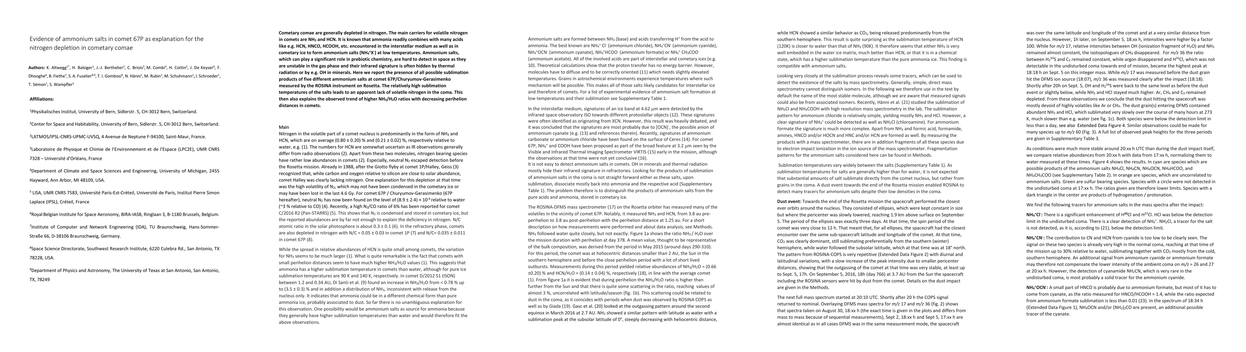 This paper reports the detection of ammonium salts in comet 67P/Churyumov-Gerasimenko using the ROSINA instrument, providing an explanation for the nitrogen depletion in cometary comae. The high sublimation temperatures of these salts result in a lack of volatile nitrogen, correlating with higher NH3/H2O ratios closer to perihelion.