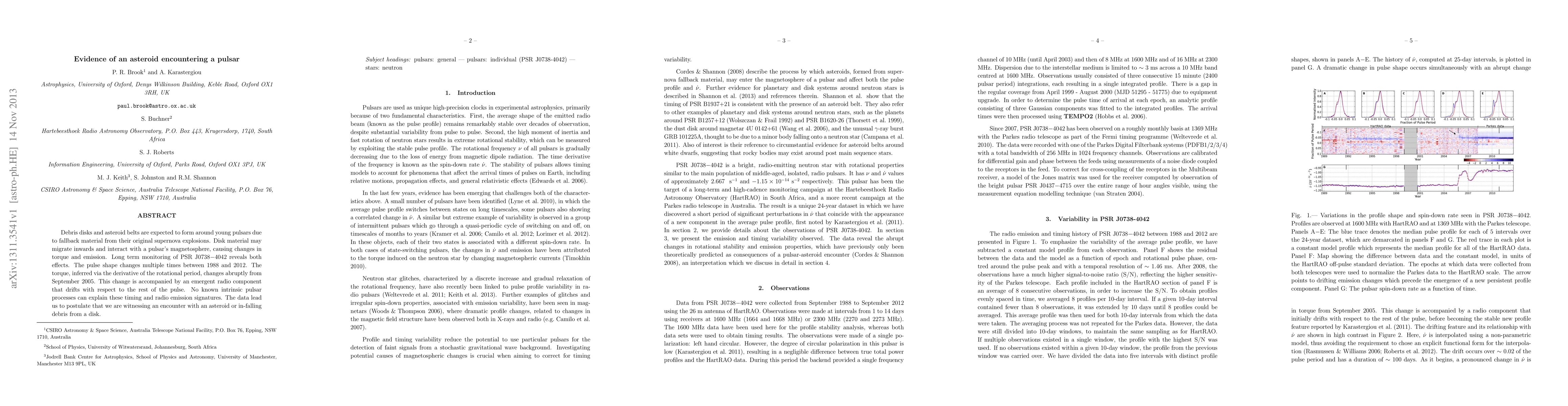 This research identifies significant changes in the pulsar PSR J0738-4042's torque and pulse shape, suggesting an asteroid or debris disk interaction. The observed radio emission component and abrupt torque change in 2005 indicate an external encounter, likely with an asteroid.