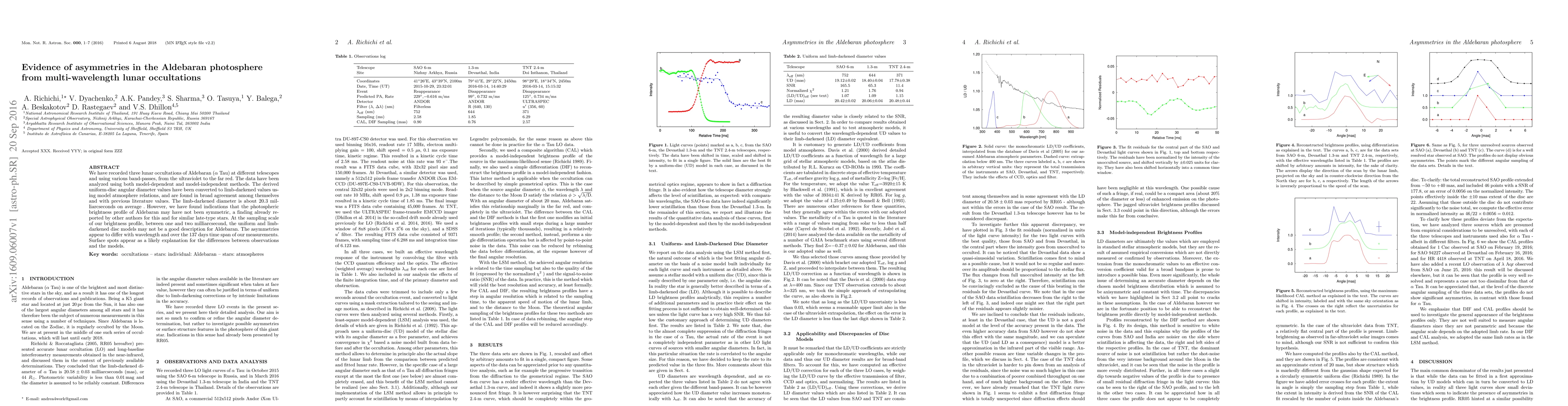 We have recorded three lunar occultations of Aldebaran (AlfTau) at different telescopes and using various band-passes, from the ultraviolet to the far red. The data have been analyzed using both model-dependent and model-independent methods. The derived uniform-disc angular diameter values have been converted to limb-darkened values using model atmosphere relations, and are found in broad agreement among themselves and with previous literature values. The limb-darkened diameter is about 20.3 milliarcseconds on average . However, we have found indications that the photospheric brightness profile of Aldebaran may have not been symmetric, a finding already reported by other authors for this and for similar late-type stars. At the sampling scale of our brightness profile, between one and two milliarcsecond, the uniform and limb-darkened disc models may not be a good description for Aldebaran. The asymmetries appear to differ with wavelength and over the 137 days time span of our measurements. Surface spots appear as a likely explanation for the differences between observations and the models.