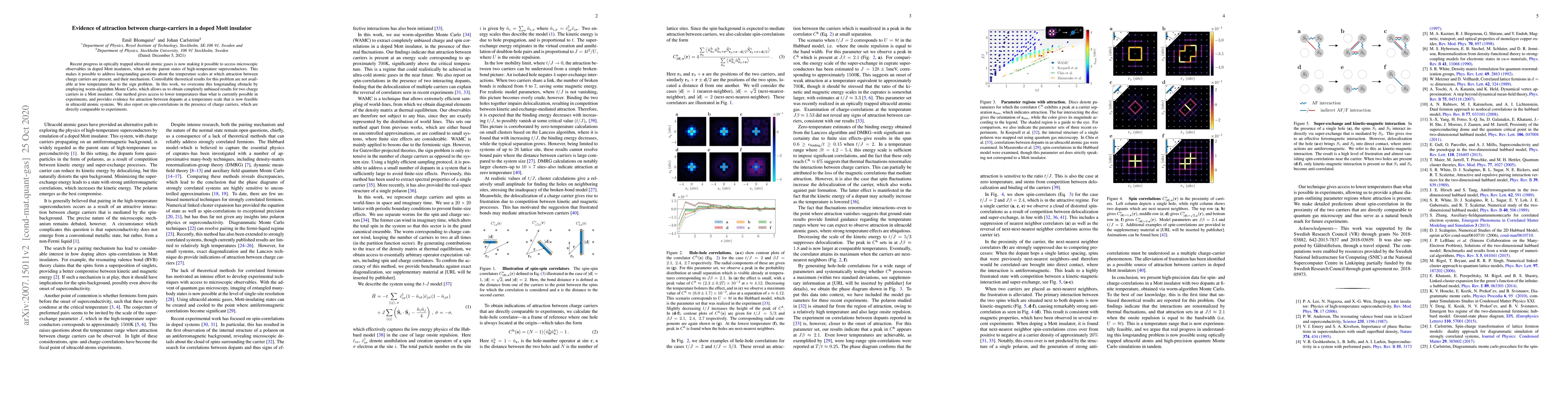This research uses the worm-algorithm Monte Carlo method to show evidence of attraction between charge carriers in doped Mott insulators, a parent state of high-temperature superconductors. The study accesses lower temperatures than current experiments, revealing attraction scales achievable in ultracold atomic systems, and also reports on spin-correlations in the presence of charge carriers, comparable to experiments.