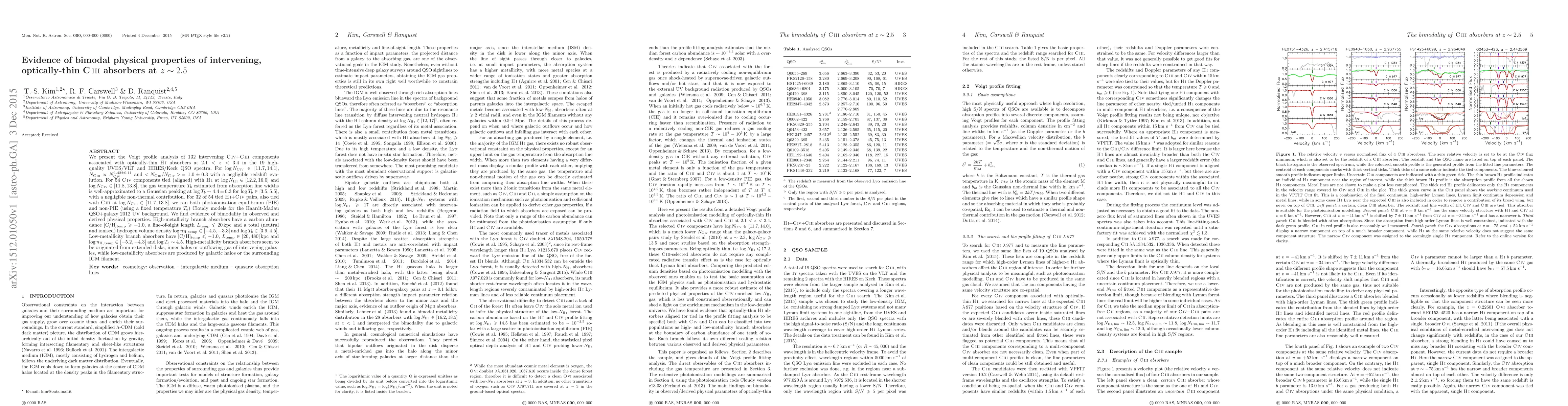 Research finds bimodal physical properties in optically-thin CIII absorbers at z ~ 2.5, with high-metallicity branch absorbers originating from galaxy disks or outflows and low-metallicity absorbers from galactic halos or IGM filaments.