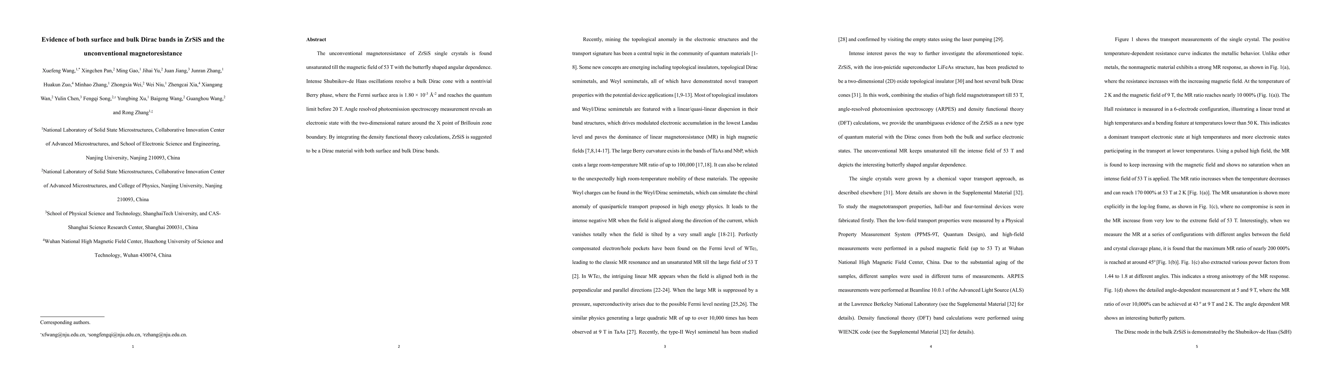 ZrSiS single crystals exhibit unconventional magnetoresistance and host both surface and bulk Dirac bands, as evidenced by Shubnikov-de Haas oscillations and angle-resolved photoemission spectroscopy, suggesting its classification as a Dirac material.