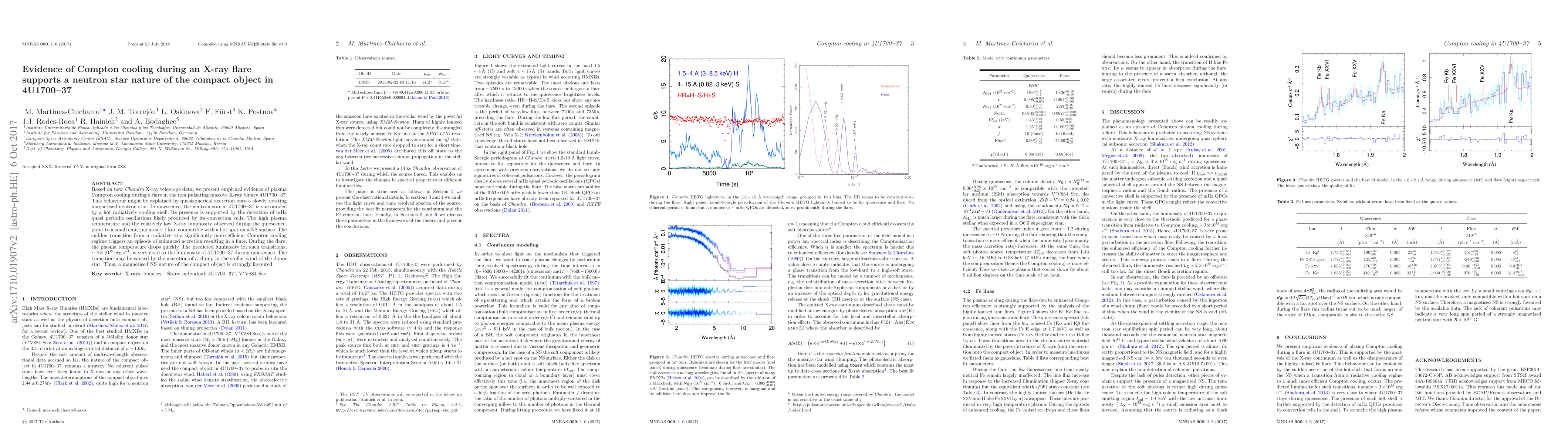 Based on new Chandra X-ray telescope data, we present empirical evidence of plasma Compton cooling during a flare in the non pulsating massive X-ray binary 4U1700-37. This behaviour might be explained by quasispherical accretion onto a slowly rotating magnetised neutron star. In quiescence, the neutron star in 4U1700-37 is surrounded by a hot radiatively cooling shell. Its presence is supported by the detection of mHz quasi periodic oscillations likely produced by its convection cells. The high plasma temperature and the relatively low X-ray luminosity observed during the quiescence, point to a small emitting area about 1 km, compatible with a hot spot on a NS surface. The sudden transition from a radiative to a significantly more efficient Compton cooling regime triggers an episode of enhanced accretion resulting in a flare. During the flare, the plasma temperature drops quickly. The predicted luminosity for such transitions, Lx = 3 x 10^35 erg s-1, is very close to the luminosity of 4U1700-37 during quiescence. The transition may be caused by the accretion of a clump in the stellar wind of the donor star. Thus, a magnetised NS nature of the compact object is strongly favoured.