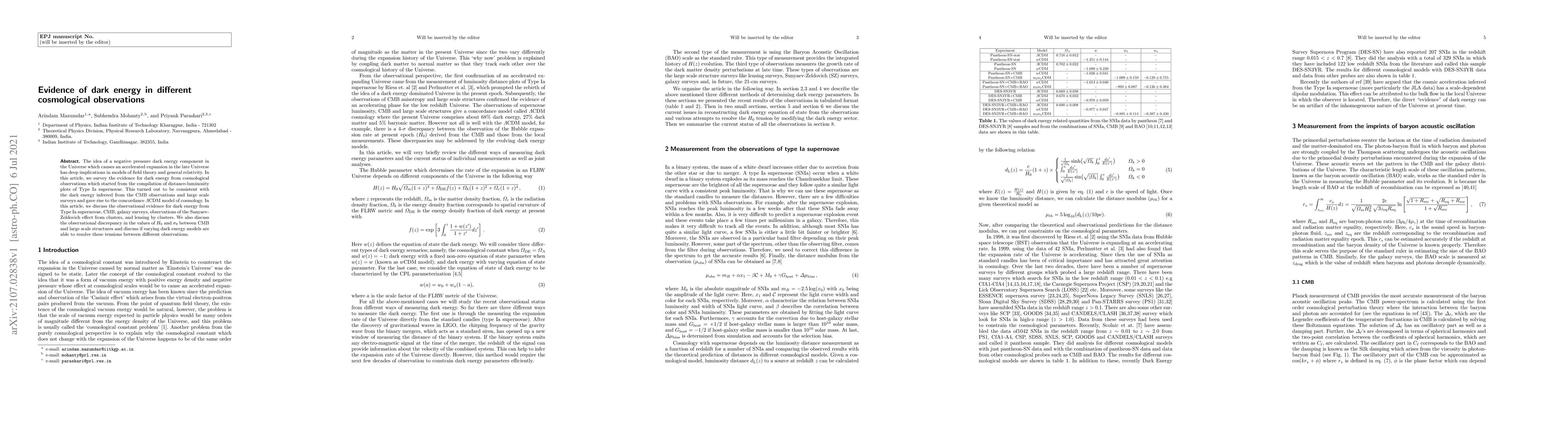 The idea of a negative-pressure dark energy component in the Universe which causes an accelerated expansion in the late Universe has deep implications in models of field theory and general relativity. In this article, we survey the evidence for dark energy from cosmological observations which started from the compilation of distance-luminosity plots of Type Ia supernovae. This turned out to be consistent with the dark energy inferred from the CMB observations and large scale surveys and gave rise to the concordance $\Lambda$CDM model of cosmology. In this article, we discuss the observational evidence for dark energy from Type Ia supernovae, CMB, galaxy surveys, observations of the Sunyaev-Zeldovich effect from clusters, and lensing by clusters. We also discuss the observational discrepancy in the values of $H_0$ and $\sigma_8$ between CMB and large scale structures and discuss if varying dark energy models are able to resolve these tensions between different observations.