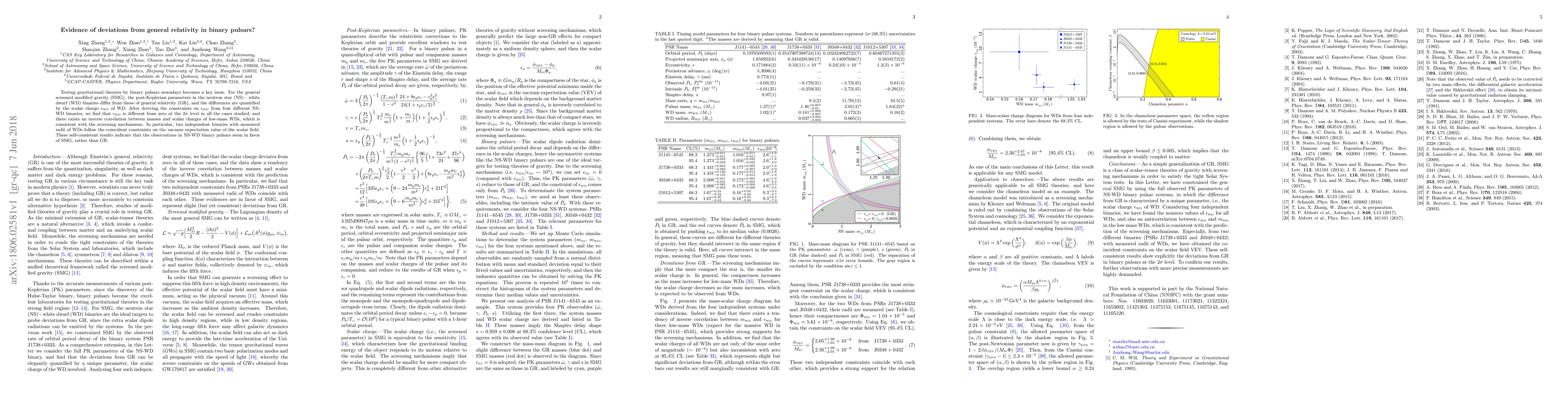 Testing gravitational theories by binary pulsars nowadays becomes a key issue. For the general screened modified gravity (SMG), the post-Keplerian parameters in the neutron star (NS) - white dwarf (WD) binaries differ from those of general relativity (GR), and the differences are quantified by the scalar charge $\epsilon_{\scriptscriptstyle\rm WD}$ of WD. After deriving the constraints on $\epsilon_{\scriptscriptstyle\rm WD}$ from four different NS-WD binaries, we find that $\epsilon_{\scriptscriptstyle\rm WD}$ is different from zero at the 2$\sigma$ level in all the cases studied, and there exists an inverse correlation between masses and scalar charges of low-mass WDs, which is consistent with the screening mechanisms. In particular, two independent binaries with measured radii of WDs follow the coincident constraints on the vacuum expectation value of the scalar field. These self-consistent results indicate that the observations in NS-WD binary pulsars seem in favor of SMG, rather than GR.