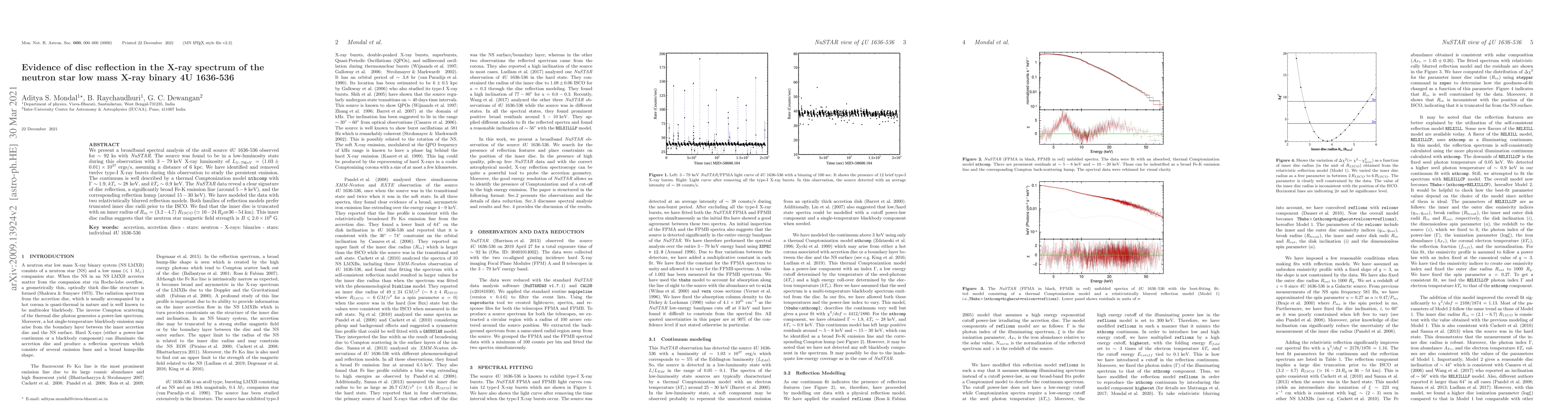 We present a broadband spectral analysis of the atoll source 4U~1636-536 observed for $\sim92$ ks with \nustar{}. The source was found to be in a low-luminosity state during this observation with $3-79 \kev{}$ X-ray luminosity of $L_{3-79 keV}=(1.03\pm0.01)\times 10^{37}$ ergs/s, assuming a distance of 6 kpc. We have identified and removed twelve type-I X-ray bursts during this observation to study the persistent emission. The continuum is well described by a thermal Comptonization model {\tt nthcomp} with $\Gamma\sim1.9$, $kT_{e}\sim28 \kev{}$, and $kT_{s}\sim0.9\kev{}$. The \nustar{} data reveal a clear signature of disc reflection, a significantly broad Fe-K emission line (around $5-8\kev{}$), and the corresponding reflection hump (around $15-30\kev{}$). We have modeled the data with two relativistically blurred reflection models. Both families of reflection models prefer truncated inner disc radii prior to the ISCO. We find that the inner disc is truncated with an inner radius of $R_{in}=(3.2-4.7)\;R_{ISCO}$ ($\simeq16-24\,R_{g}\: \text{or}\: 36-54$ km). This inner disc radius suggests that the neutron star magnetic field strength is $B\leq2.0\times10^{9}$ G.
