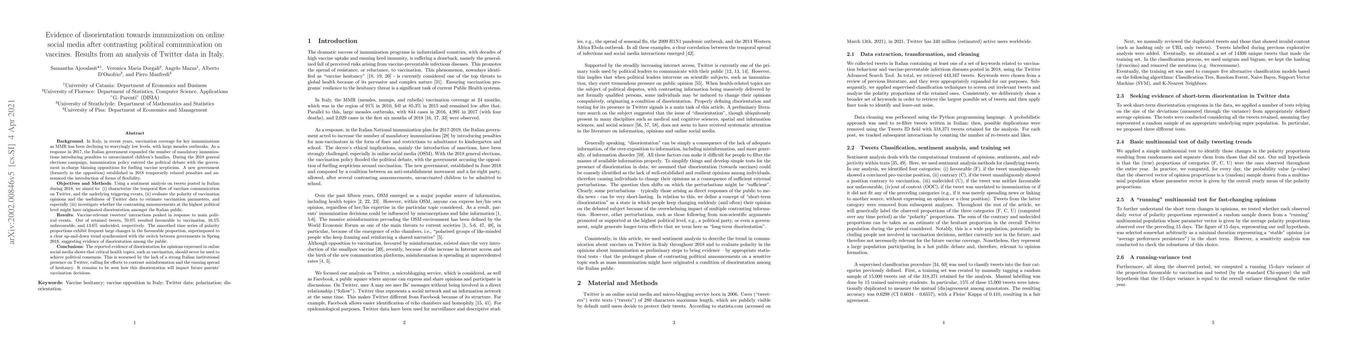 Background. In Italy, in recent years, vaccination coverage for key immunizations as MMR has been declining to worryingly low levels. In 2017, the Italian Gov't expanded the number of mandatory immunizations introducing penalties to unvaccinated children's families. During the 2018 general elections campaign, immunization policy entered the political debate with the Gov't in charge blaming oppositions for fuelling vaccine scepticism. A new Gov't established in 2018 temporarily relaxed penalties. Objectives and Methods. Using a sentiment analysis on tweets posted in Italian during 2018, we aimed to: (i) characterize the temporal flow of vaccines communication on Twitter (ii) evaluate the polarity of vaccination opinions and usefulness of Twitter data to estimate vaccination parameters, and (iii) investigate whether the contrasting announcements at the highest political level might have originated disorientation amongst the Italian public. Results. Vaccine-relevant tweeters interactions peaked in response to main political events. Out of retained tweets, 70.0% resulted favourable to vaccination, 16.5% unfavourable, and 13.6% undecided, respectively. The smoothed time series of polarity proportions exhibit frequent large changes in the favourable proportion, enhanced by an up and down trend synchronized with the switch between gov't suggesting evidence of disorientation among the public. Conclusion. The reported evidence of disorientation documents that critical immunization topics, should never be used for political consensus. This is especially true given the increasing role of online social media as information source, which might yield to social pressures eventually harmful for vaccine uptake, and is worsened by the lack of institutional presence on Twitter, calling for efforts to contrast misinformation and the ensuing spread of hesitancy.