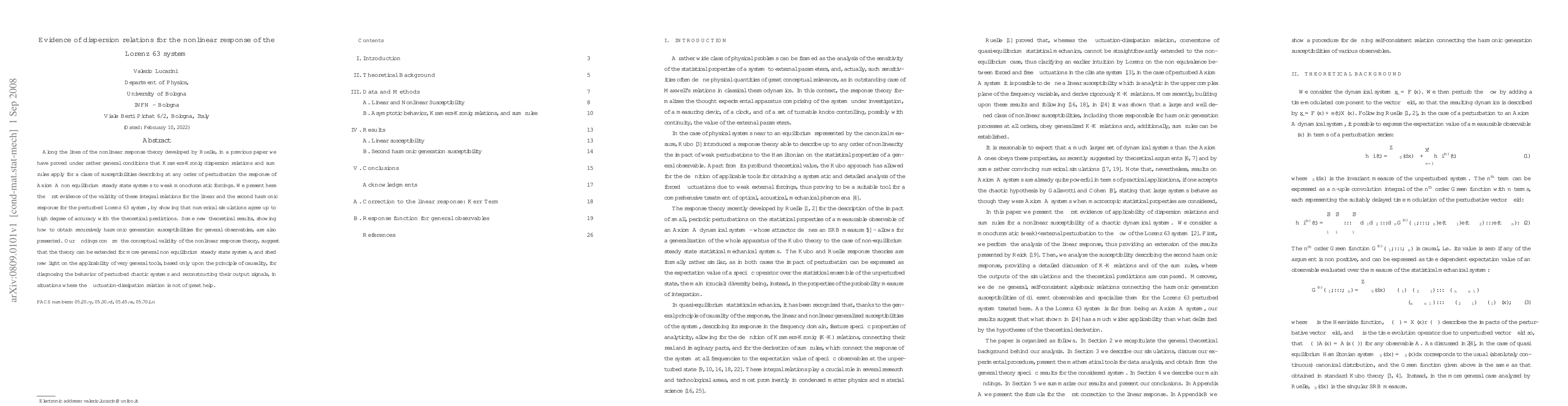Along the lines of the nonlinear response theory developed by Ruelle, in a previous paper we have proved under rather general conditions that Kramers-Kronig dispersion relations and sum rules apply for a class of susceptibilities describing at any order of perturbation the response of Axiom A non equilibrium steady state systems to weak monochromatic forcings. We present here the first evidence of the validity of these integral relations for the linear and the second harmonic response for the perturbed Lorenz 63 system, by showing that numerical simulations agree up to high degree of accuracy with the theoretical predictions. Some new theoretical results, showing how to obtain recursively harmonic generation susceptibilities for general observables, are also presented. Our findings confirm the conceptual validity of the nonlinear response theory, suggest that the theory can be extended for more general non equilibrium steady state systems, and shed new light on the applicability of very general tools, based only upon the principle of causality, for diagnosing the behavior of perturbed chaotic systems and reconstructing their output signals, in situations where the fluctuation-dissipation relation is not of great help.