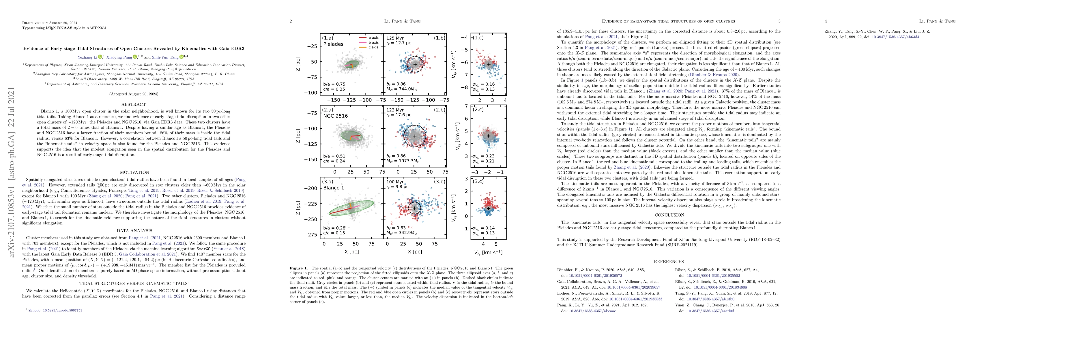This study reveals early-stage tidal disruption in the Pleiades and NGC 2516 open clusters using Gaia EDR3 data, showing similar kinematic tails to Blanco 1 despite having more bound members. The findings suggest that the spatial elongation in these clusters is due to early-stage tidal forces.