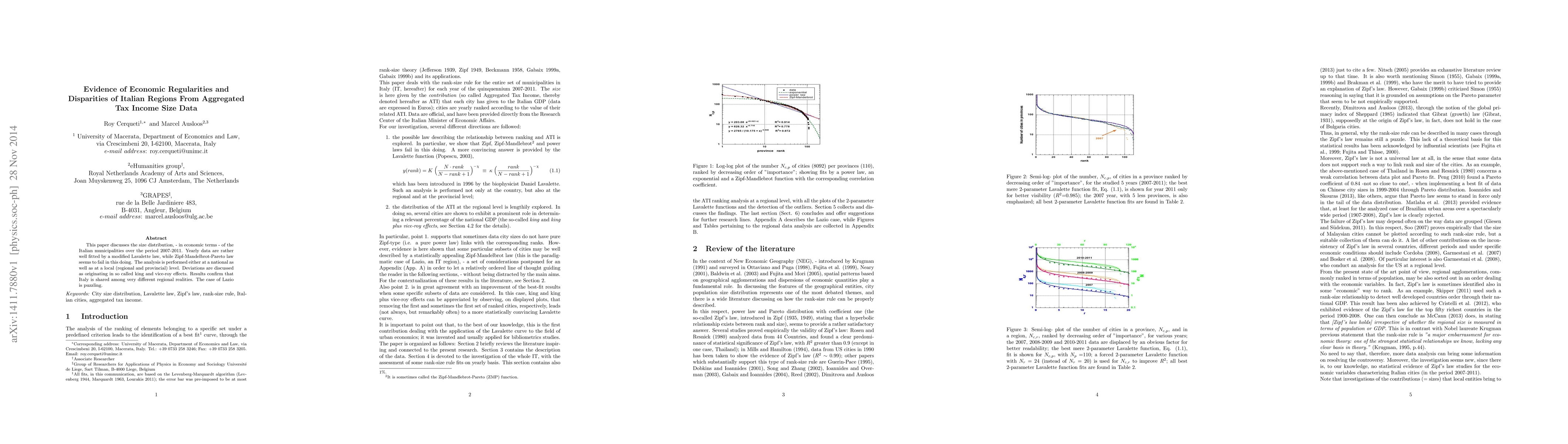 This paper discusses the size distribution, - in economic terms - of the Italian municipalities over the period 2007-2011. Yearly data are rather well fitted by a modified Lavalette law, while Zipf-Mandelbrot-Pareto law seems to fail in this doing. The analysis is performed either at a national as well as at a local (regional and provincial) level. Deviations are discussed as originating in so called king and vice-roy effects. Results confirm that Italy is shared among very different regional realities. The case of Lazio is puzzling.