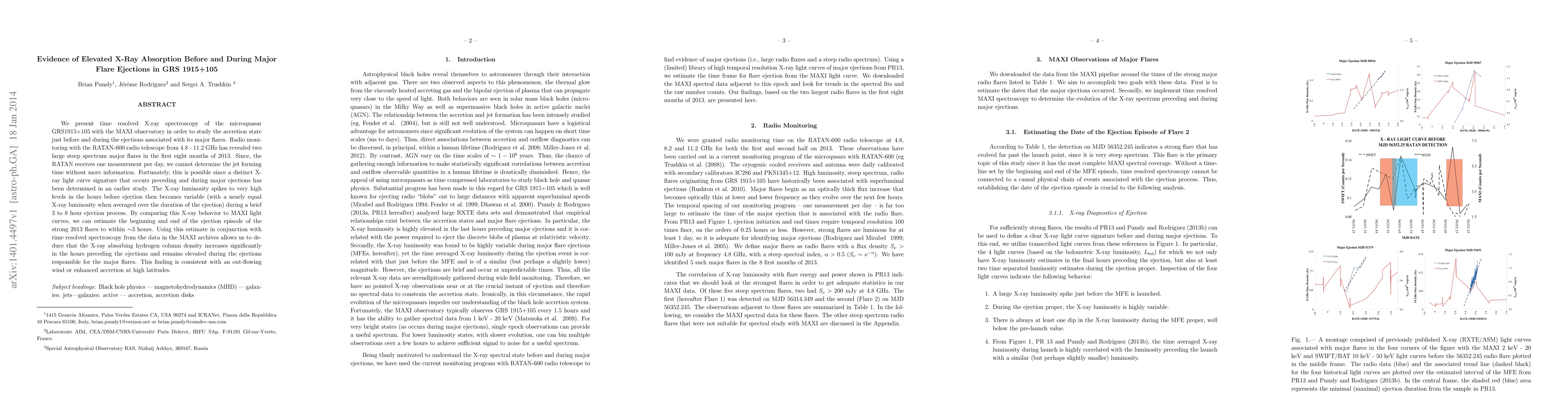 We present time resolved X-ray spectroscopy of the microquasar GRS1915+105 with the MAXI observatory in order to study the accretion state just before and during the ejections associated with its major flares. Radio monitoring with the RATAN-600 radio telescope from 4.8 - 11.2 GHz has revealed two large steep spectrum major flares in the first eight months of 2013. Since, the RATAN receives one measurement per day, we cannot determine the jet forming time without more information. Fortunately, this is possible since a distinct X-ray light curve signature that occurs preceding and during major ejections has been determined in an earlier study. The X-ray luminosity spikes to very high levels in the hours before ejection then becomes variable (with a nearly equal X-ray luminosity when averaged over the duration of the ejection) during a brief 3 to 8 hour ejection process. By comparing this X-ray behavior to MAXI light curves, we can estimate the beginning and end of the ejection episode of the strong 2013 flares to within $\sim$3 hours. Using this estimate in conjunction with time resolved spectroscopy from the data in the MAXI archives allows us to deduce that the X-ray absorbing hydrogen column density increases significantly in the hours preceding the ejections and remains elevated during the ejections responsible for the major flares. This finding is consistent with an out-flowing wind or enhanced accretion at high latitudes.