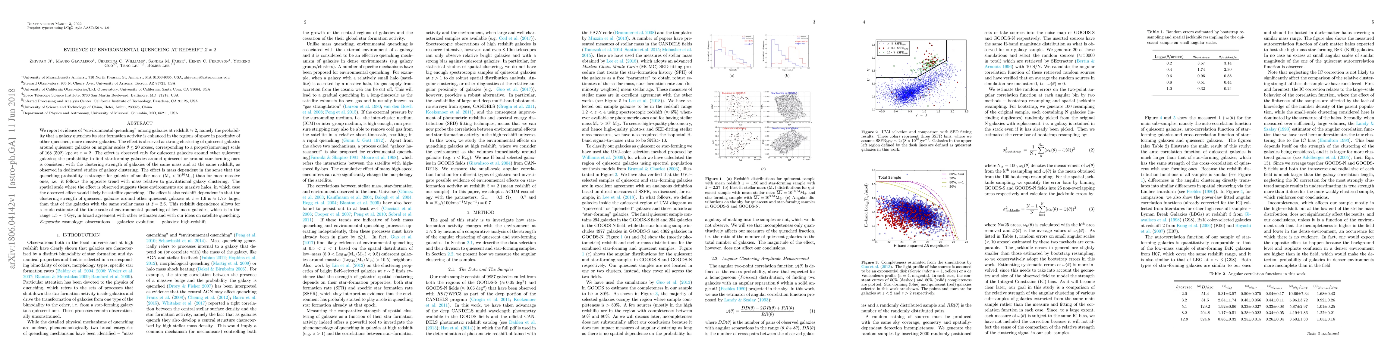 This paper provides evidence of environmental quenching at redshift z ~ 2, showing that galaxies are more likely to quench star formation when located near other quenched, more massive galaxies. The effect is stronger for smaller mass galaxies and suggests satellite quenching in massive halos.