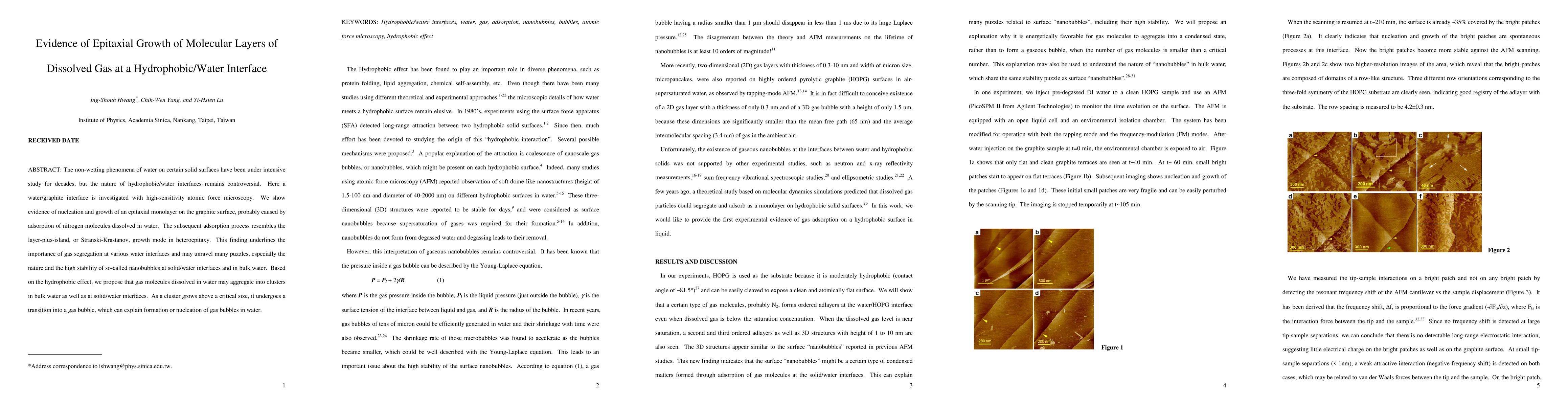 This study reveals the epitaxial growth of a molecular layer on a graphite surface via adsorption of dissolved nitrogen gas, demonstrating a layer-plus-island growth mode. The findings highlight the role of gas segregation in water interfaces, potentially explaining the stability and formation of nanobubbles.