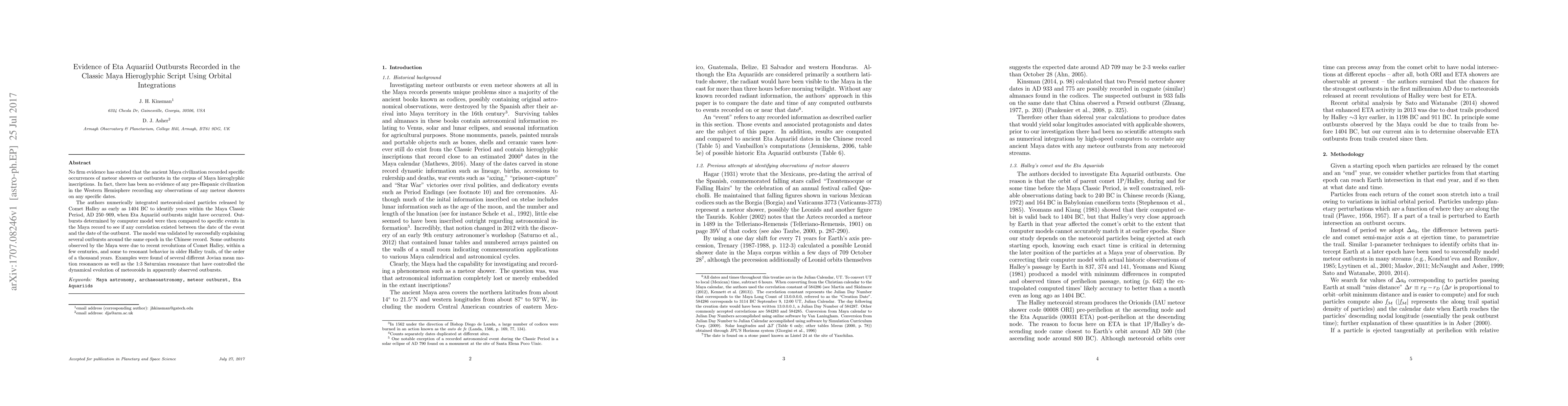 No firm evidence has existed that the ancient Maya civilization recorded specific occurrences of meteor showers or outbursts in the corpus of Maya hieroglyphic inscriptions. In fact, there has been no evidence of any pre-Hispanic civilization in the Western Hemisphere recording any observations of any meteor showers on any specific dates. The authors numerically integrated meteoroid-sized particles released by Comet Halley as early as 1404 BC to identify years within the Maya Classic Period, AD 250-909, when Eta Aquariid outbursts might have occurred. Outbursts determined by computer model were then compared to specific events in the Maya record to see if any correlation existed between the date of the event and the date of the outburst. The model was validated by successfully explaining several outbursts around the same epoch in the Chinese record. Some outbursts observed by the Maya were due to recent revolutions of Comet Halley, within a few centuries, and some to resonant behavior in older Halley trails, of the order of a thousand years. Examples were found of several different Jovian mean motion resonances as well as the 1:3 Saturnian resonance that have controlled the dynamical evolution of meteoroids in apparently observed outbursts.