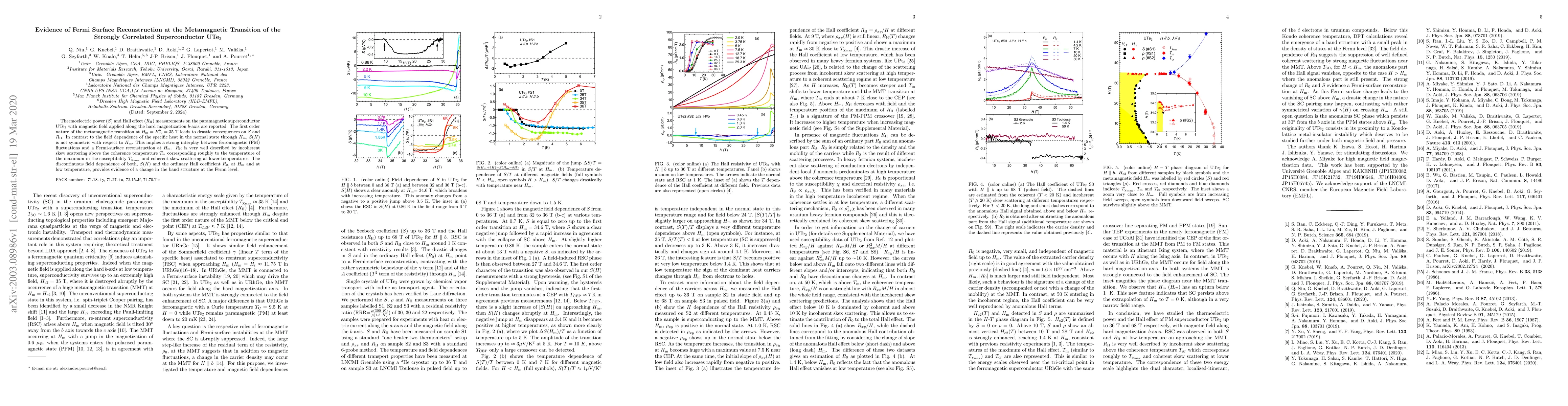 This study reports thermoelectric power and Hall effect measurements on UTe$_2$, revealing a first-order metamagnetic transition at 35 T that causes significant changes in $S$ and $R_\mathrm{H}$, indicating a Fermi-surface reconstruction and strong interaction with ferromagnetic fluctuations. The transition also suggests a modification in the band structure at the Fermi level.