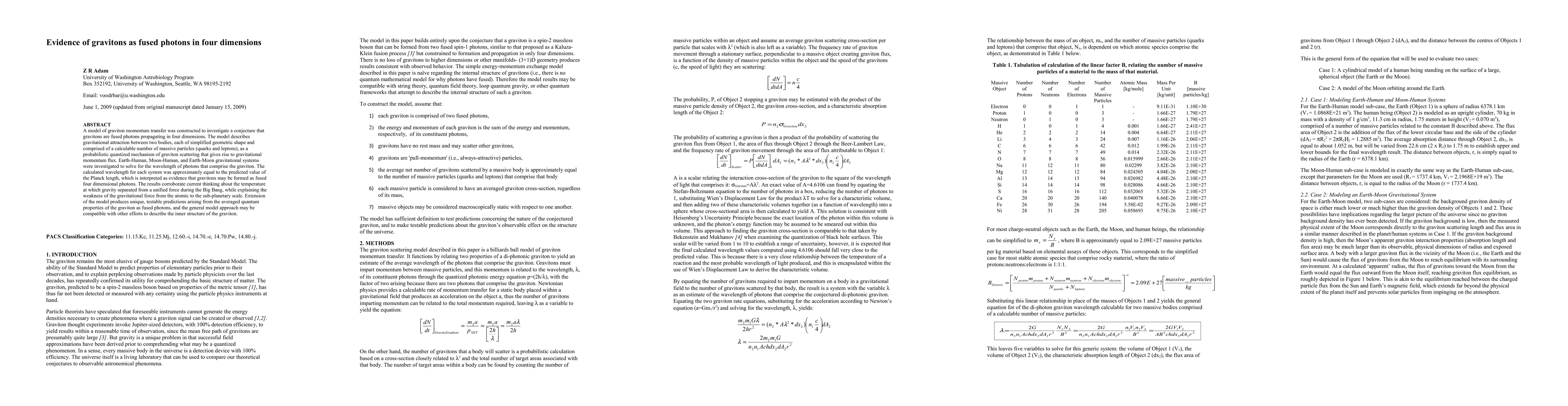 A model of graviton momentum transfer was constructed to investigate a conjecture that gravitons are fused photons propagating in four dimensions. The model describes gravitational attraction between two bodies, each of simplified geometric shape and comprised of a calculable number of massive particles (quarks and leptons), as a probabilistic quantized mechanism of graviton scattering that gives rise to gravitational momentum flux. Earth-Human, Moon-Human, and Earth-Moon gravitational systems were investigated to solve for the wavelength of photons that comprise the graviton. The calculated wavelength for each system was approximately equal to the predicted value of the Planck length, which is interpreted as evidence that gravitons may be formed as fused four dimensional photons. The results corroborate current thinking about the temperature at which gravity separated from a unified force during the Big Bang, while explaining the weakness of the gravitational force from the atomic to the sub-planetary scale. Extension of the model produces unique, testable predictions arising from the averaged quantum properties of the graviton as fused photons, and the general model approach may be compatible with other efforts to describe the inner structure of the graviton.