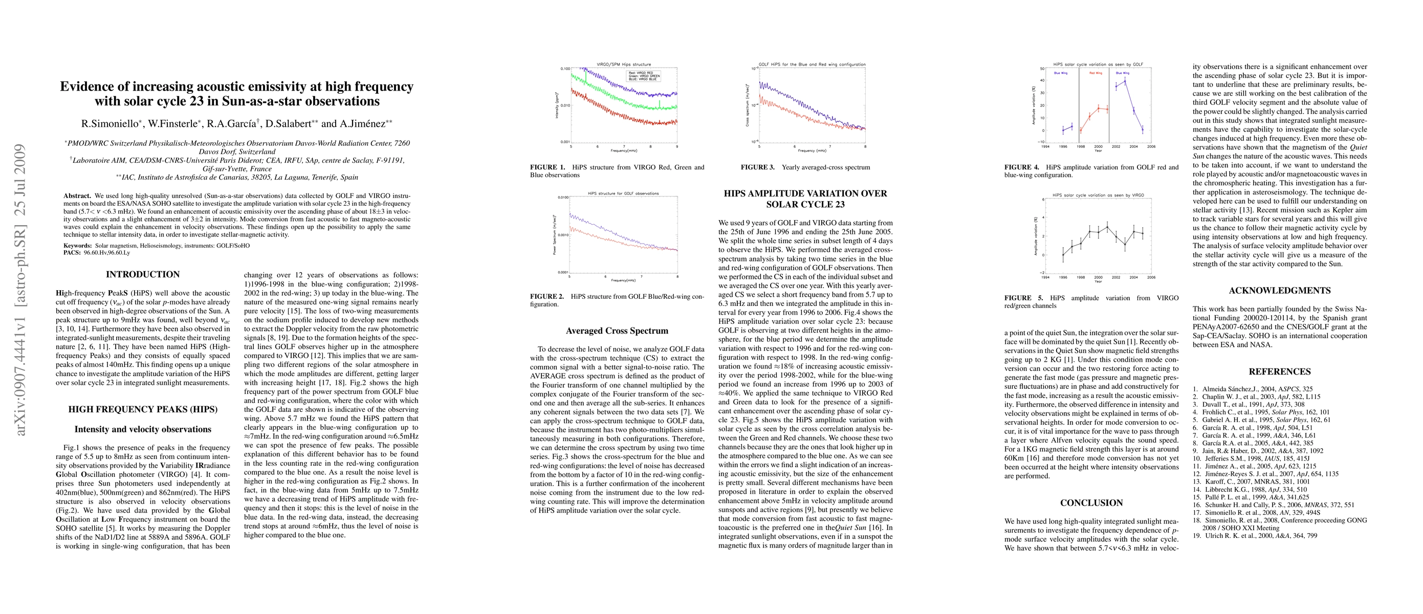 We used long high-quality unresolved (Sun-as-a-star observations) data collected by GOLF and VIRGO instruments on board the ESA/NASA SOHO satellite to investigate the amplitude variation with solar cycle 23 in the high-frequency band (5.7 < nu< 6.3 mHz). We found an enhancement of acoustic emissivity over the ascending phase of about 18+-3 in velocity observations and a slight enhancement of 3+-2 in intensity. Mode conversion from fast acoustic to fast magneto-acoustic waves could explain the enhancement in velocity observations. These findings open up the possibility to apply the same technique to stellar intensity data, in order to investigate stellar-magnetic activity.