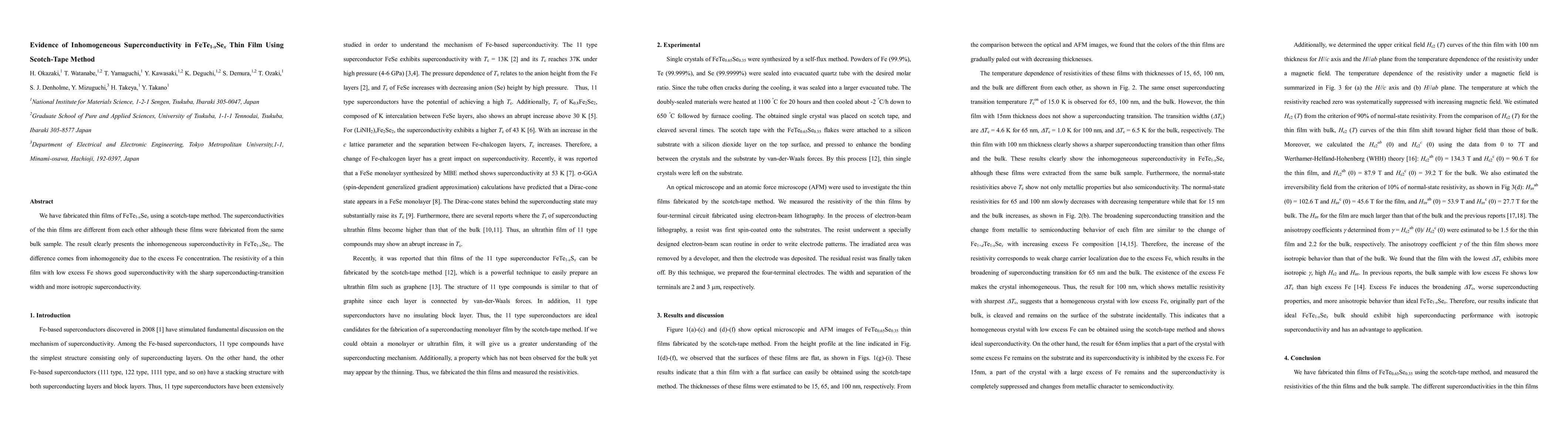 Title: Evidence of Inhomogeneous Superconductivity in FeTe$_{1-x}$Se$_x$ Thin Film Using Scotch-Tape Method Summary: FeTe$_{1-x}$Se$_x$ thin films fabricated via the scotch-tape method exhibit varied superconductivity from inhomogeneity, likely due to excess Fe concentration, with lower Fe content resulting in sharp, isotropic superconducting transitions.