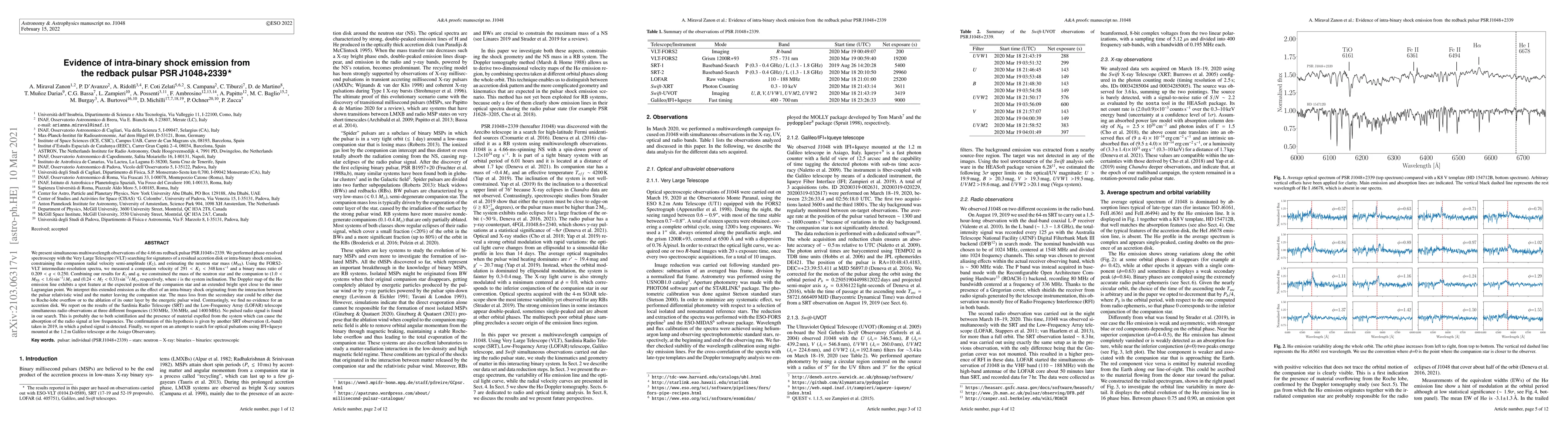 This paper reports on multiwavelength observations of the redback pulsar PSR J1048+2339, revealing intra-binary shock emission near the inner Lagrangian point, likely due to the pulsar wind interacting with the companion star's outflow. The study finds no evidence of an accretion disk and constrains the neutron star and companion star masses.