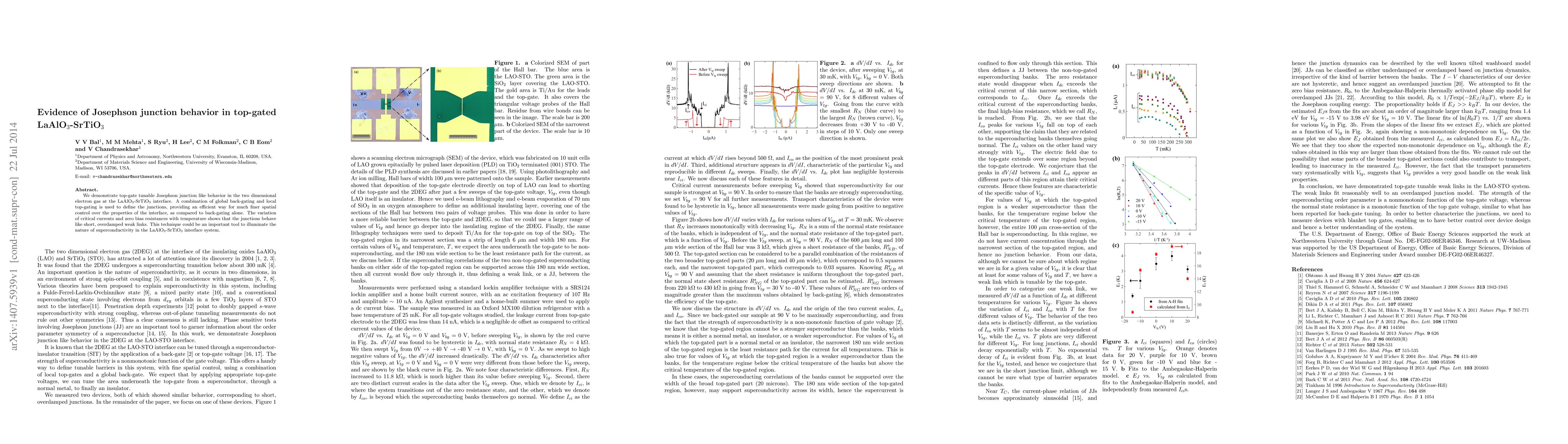 This paper demonstrates Josephson junction behavior in the LaAlO$_3$-SrTiO$_3$ interface using top-gate tuning, showing critical current variations and zero bias resistances indicative of short, overdamped weak links. This method provides superior spatial control over interface properties, potentially aiding in understanding superconductivity.