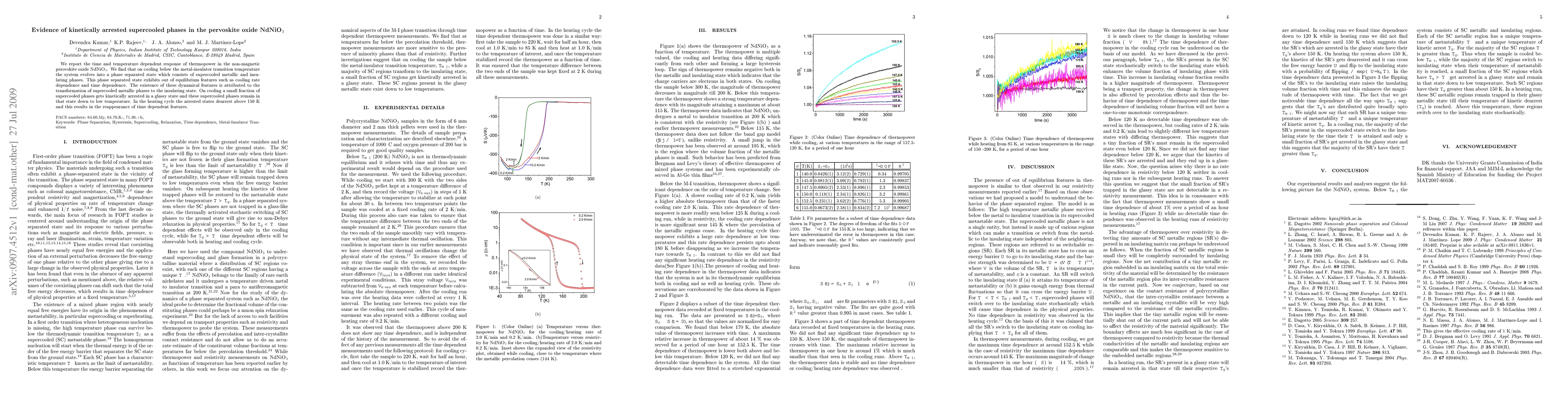 We report the time and temperature dependent response of thermopower in the non-magnetic perovskite oxide NdNiO$_3$. We find that on cooling below the metal-insulator transition temperature the system evolves into a phase separated state which consists of supercooled metallic and insulating phases. This phase separated state exhibits out of equilibrium features such as cooling rate dependence and time dependence. The existence of these dynamical features is attributed to the transformation of supercooled metallic phases to the insulating state. On cooling a small fraction of supercooled phases gets kinetically arrested in a glassy state and these supercooled phases remain in that state down to low temperature. In the heating cycle the arrested states dearrest above 150 K and this results in the reappearance of time dependent features.