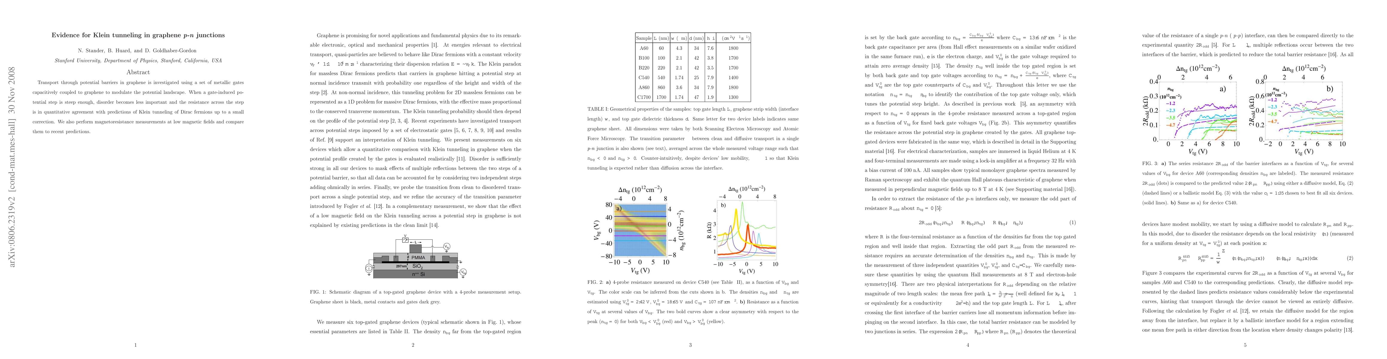 This study investigates Klein tunneling in graphene p-n junctions using metallic gates to modulate potential barriers, finding that Dirac fermions exhibit tunneling behavior in agreement with theoretical predictions, with minor corrections observed. Magnetoresistance measurements at low fields also align with recent theoretical models.