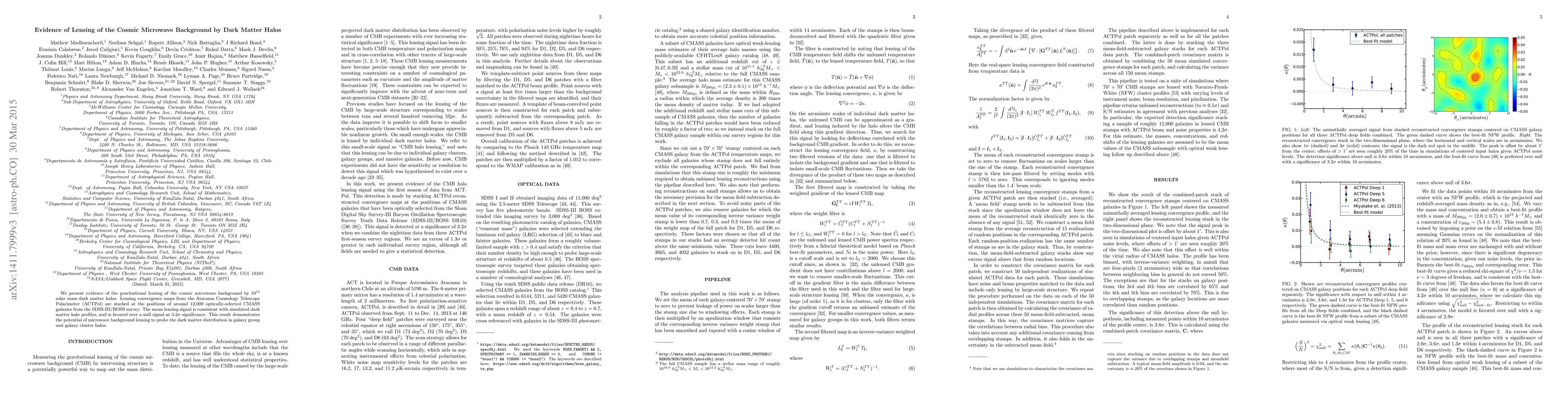 This study provides evidence for the gravitational lensing of the cosmic microwave background by dark matter halos, using data from the ACTPol telescope and galaxy selections from the BOSS survey. The observed lensing signal aligns with simulated dark matter profiles, confirming the method's potential to investigate dark matter in galaxy clusters.