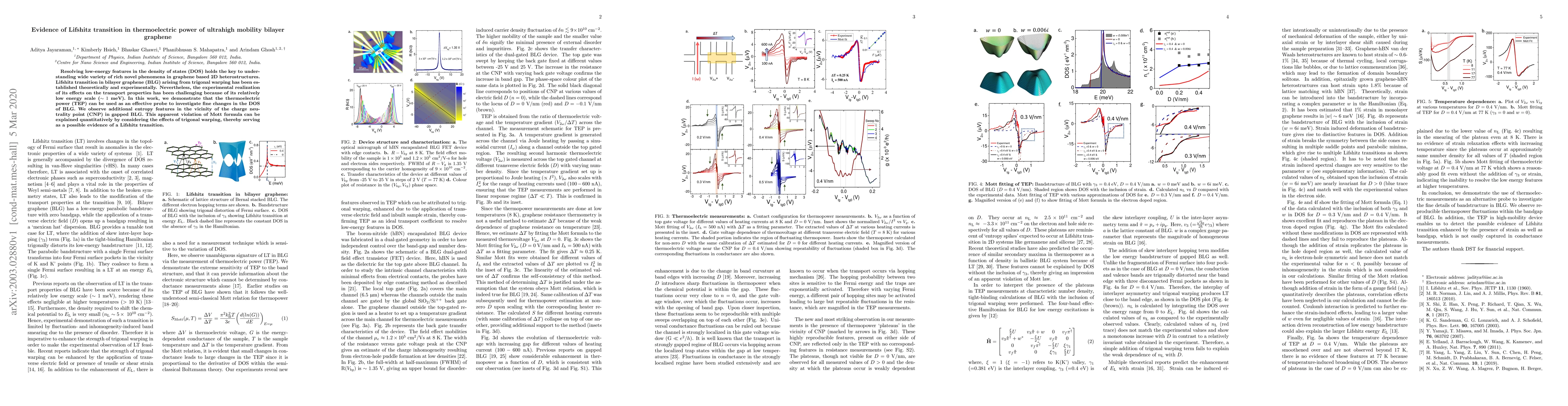 Resolving low-energy features in the density of states (DOS) holds the key to understanding wide variety of rich novel phenomena in graphene based 2D heterostructures. Lifshitz transition in bilayer graphene (BLG) arising from trigonal warping has been established theoretically and experimentally. Nevertheless, the experimental realization of its effects on the transport properties has been challenging because of its relatively low energy scale ($\sim 1$ meV). In this work, we demonstrate that the thermoelectric power (TEP) can be used as an effective probe to investigate fine changes in the DOS of BLG. We observe additional entropy features in the vicinity of the charge neutrality point (CNP) in gapped BLG. This apparent violation of Mott formula can be explained quantitatively by considering the effects of trigonal warping, thereby serving as a possible evidence of a Lifshitz transition.