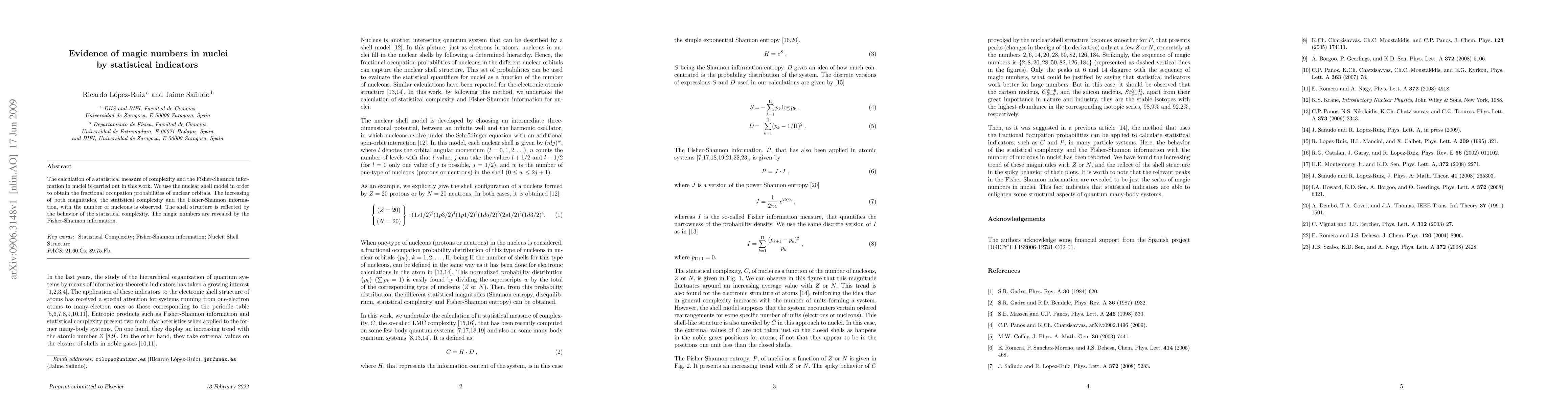 This paper explores the statistical complexity and Fisher-Shannon information in nuclei to identify magic numbers, revealing that these quantities increase with nucleon count and reflect the shell structure, with magic numbers specifically highlighted by the Fisher-Shannon information.