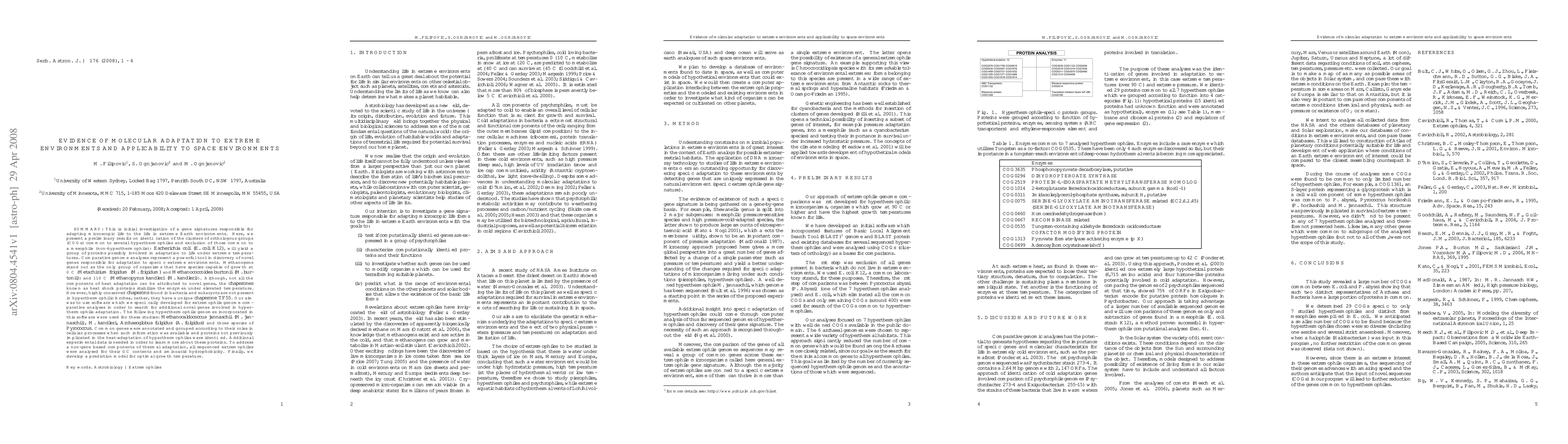 This is initial study of a gene signatures responsible for adapting microscopic life to the life in extreme Earth environments. We present a results on ID of the clusters of COGs common to several hyperthermophiles and exclusion of those common to a mesophile: E.coli.K12, will yield a group of proteins possibly involved in adaptation to life under extreme T. Methanogens stand out as the only group of organisms that have species capable of growth at 0C (M.frigidum and M.burtonii) and 110C (M.kandleri). Not all the components of heat adaptation can be attributed to novel genes, the chaperones known as heat shock proteins stabilize the enzymes under elevated temperature. Highly conserved chaperons found in bacteria and eukaryots are not present in hyperthermophilic Archea, rather, they have a unique chaperone TF55. Our aim is to use software which we specifically developed for extremophile genome comparative analyses in order to search for additional novel genes involved in hyperthermophile adaptation. The following hyperthermophile genomes incorporated in our software were used for these studies: M.jannaschii, M.kandleri, A.fulgidus and 3 species of Pyrococcus. Common genes were annotated and grouped according to their roles in cellular processes when information was available and proteins not previously implicated in the heat-adaptation of hyperthermophiles were identified. Additional experimental data is needed in order to learn more about these proteins. To address a non-gene based components of thermal adaptation, all sequenced extremophiles were analysed for their GC contents and aminoacid hydrophobicity. We develop a prediction model for optimal growth temperature.