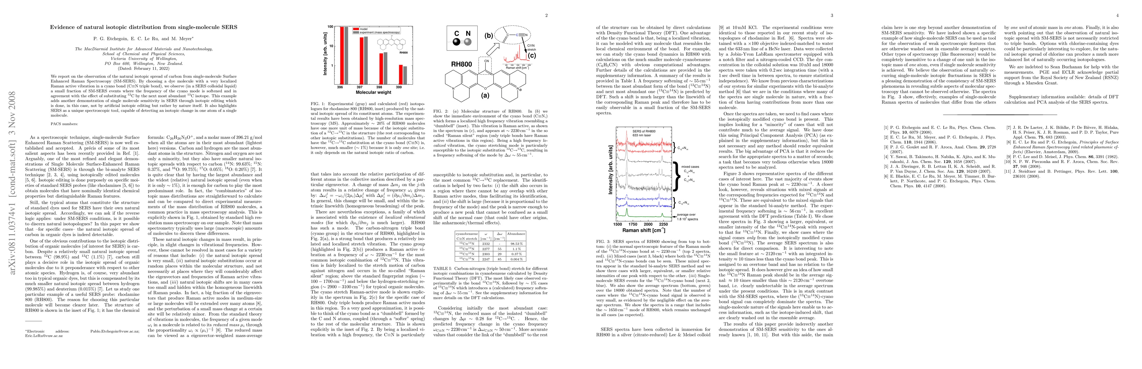 This paper demonstrates single-molecule Surface Enhanced Raman Spectroscopy (SM-SERS) detecting natural isotopic distribution of carbon in a dye molecule, showing a shift in the cyano mode frequency consistent with $^{12}$C to $^{13}$C substitution, highlighting SERS's sensitivity to isotopic changes in single molecules.