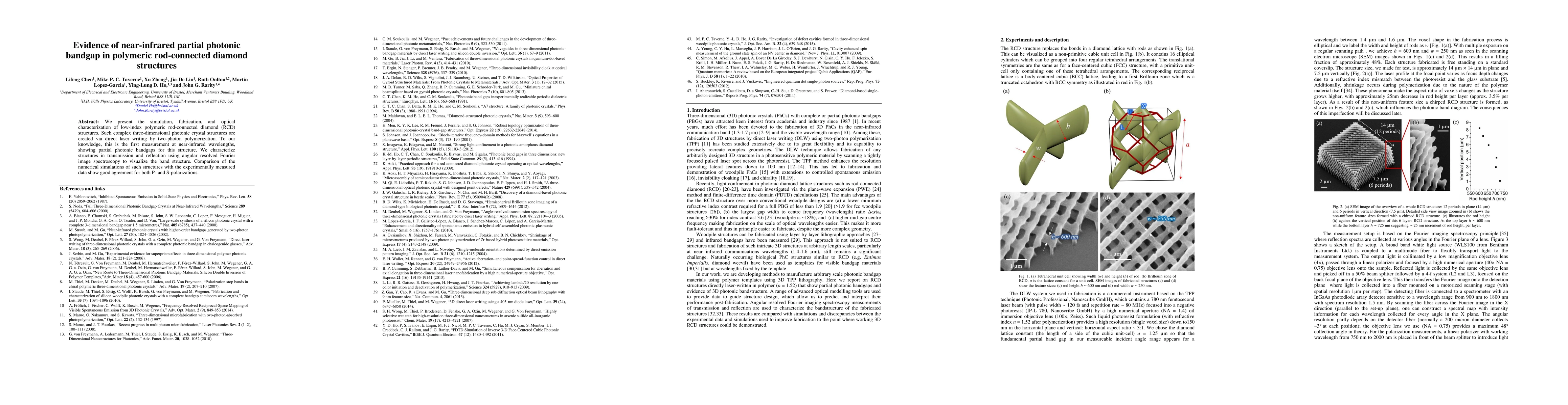 We present the simulation, fabrication, and optical characterization of low-index polymeric rod-connected diamond (RCD) structures. Such complex three-dimensional photonic crystal structures are created via direct laser writing by two-photon polymerization. To our knowledge, this is the first measurement at near-infrared wavelengths, showing partial photonic bandgaps for this structure. We characterize structures in transmission and reflection using angular resolved Fourier image spectroscopy to visualize the band structure. Comparison of the numerical simulations of such structures with the experimentally measured data show good agreement for both P- and S-polarizations.