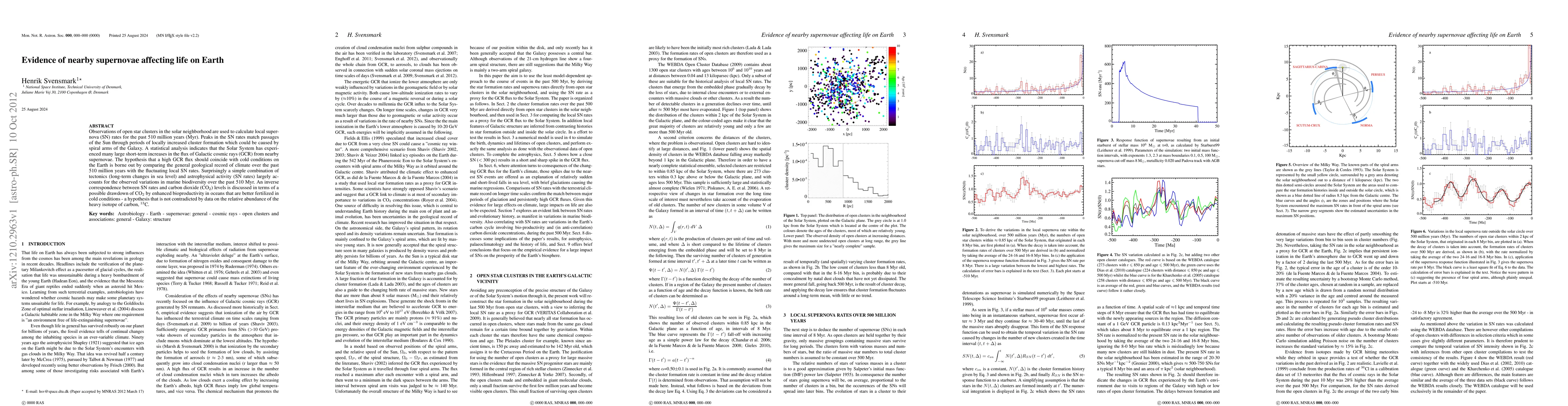 Observations of open star clusters in the solar neighborhood are used to calculate local supernova (SN) rates for the past 510 million years (Myr). Peaks in the SN rates match passages of the Sun through periods of locally increased cluster formation which could be caused by spiral arms of the Galaxy. A statistical analysis indicates that the Solar System has experienced many large short-term increases in the flux of Galactic cosmic rays (GCR) from nearby supernovae. The hypothesis that a high GCR flux should coincide with cold conditions on the Earth is borne out by comparing the general geological record of climate over the past 510 million years with the fluctuating local SN rates. Surprisingly a simple combination of tectonics (long-term changes in sea level) and astrophysical activity (SN rates) largely accounts for the observed variations in marine biodiversity over the past 510 Myr. An inverse correspondence between SN rates and carbon dioxide (CO$_2$) levels is discussed in terms of a possible drawdown of CO$_2$ by enhanced bioproductivity in oceans that are better fertilized in cold conditions - a hypothesis that is not contradicted by data on the relative abundance of the heavy isotope of carbon, $^{13}$C.