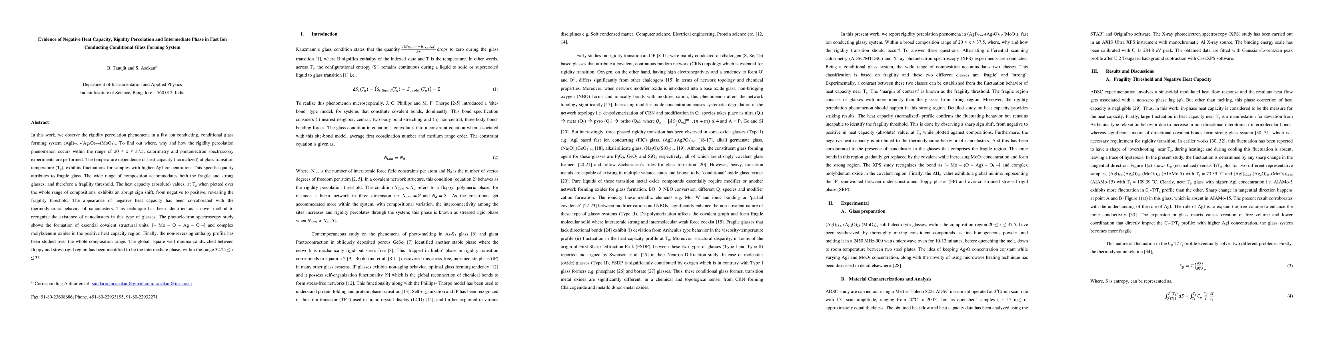 This paper investigates the rigidity percolation phenomenon in a fast ion conducting glass forming system, revealing negative heat capacity and an intermediate phase. Calorimetry and spectroscopy show that the system exhibits both fragile and strong glass behaviors, with a fragility threshold identified by an abrupt sign shift in heat capacity.