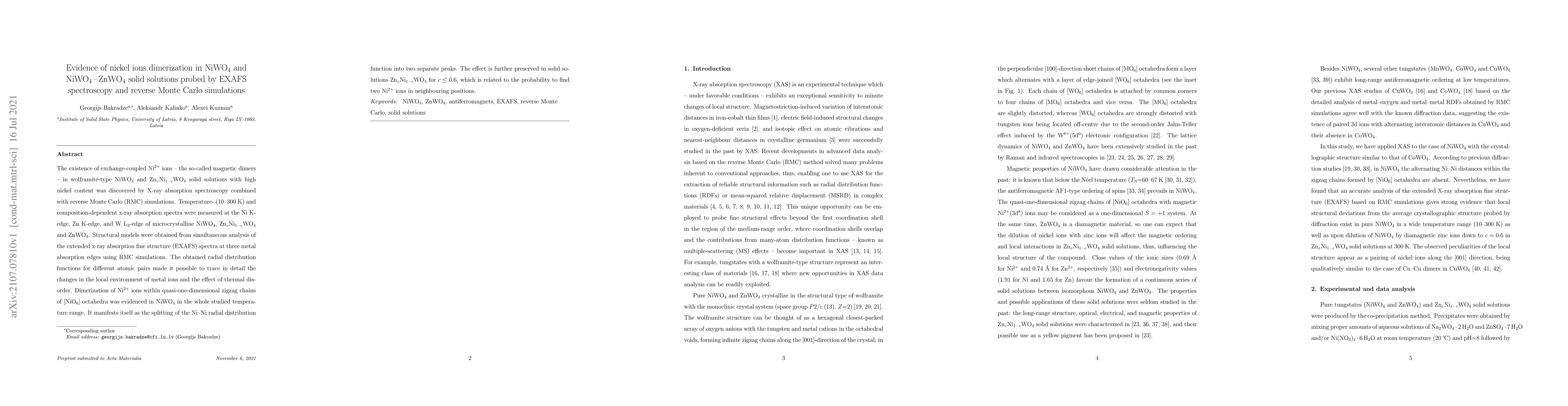 The existence of exchange-coupled Ni$^{2+}$ ions -- the so-called magnetic dimers -- in wolframite-type NiWO$_4$ and Zn$_c$Ni$_{1-c}$WO$_4$ solid solutions with high nickel content was discovered by X-ray absorption spectroscopy combined with reverse Monte Carlo (RMC) simulations. Temperature- (10--300 K) and composition-dependent x-ray absorption spectra were measured at the Ni K-edge, Zn K-edge, and W L$_3$-edge of microcrystalline NiWO$_4$, Zn$_c$Ni$_{1-c}$WO$_4$ and ZnWO$_4$. Structural models were obtained from simultaneous analysis of the extended x-ray absorption fine structure (EXAFS) spectra at three metal absorption edges using RMC simulations. The obtained radial distribution functions for different atomic pairs made it possible to trace in detail the changes in the local environment of metal ions and the effect of thermal disorder. Dimerization of Ni$^{2+}$ ions within quasi-one-dimensional zigzag chains of [NiO$_6$] octahedra was evidenced in NiWO$_4$ in the whole studied temperature range. It manifests itself as the splitting of the Ni-Ni radial distribution function into two separate peaks. The effect is further preserved in solid solutions Zn$_c$Ni$_{1-c}$WO$_4$ for $c \leq 0.6$, which is related to the probability to find two Ni$^{2+}$ ions in neighboring positions.