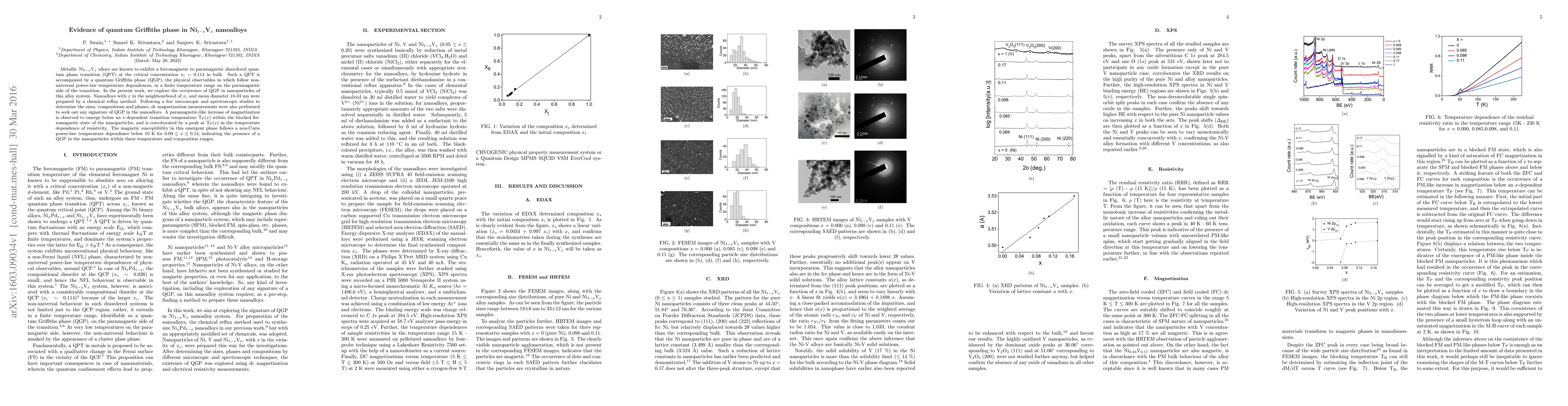 Metallic Ni$_{1-x}$V$_x$ alloys are known to exhibit a ferromagnetic to paramagnetic disordered quantum phase transition (QPT) at the critical concentration $x_c \sim$ 0.114 in bulk. Such a QPT is accompanied by a quantum Griffiths phase (QGP), the physical observables in which follow non-universal power-law temperature dependences, in a finite temperature range on the paramagnetic side of the transition. In the present work, we explore the occurrence of QGP in nanoparticles of this alloy system. Nanoalloys with $x$ in the neighbourhood of $x_c$ and mean diameter 18-33 nm were prepared by a chemical reflux method. Following a few microscopic and spectroscopic studies to determine the sizes, compositions and phases, dc magnetization measurements were also performed to seek out any signature of QGP in the nanoalloys. A paramagnetic-like increase of magnetization is observed to emerge below an $x$-dependent transition temperature $\rm{T_P} (\it{x})$ within the blocked ferromagnetic state of the nanoparticles, and is corroborated by a peak at $\rm{T_P} (\it{x})$ in the temperature dependence of resistivity. The magnetic susceptibility in this emergent phase follows a non-Curie power-law temperature dependence below 10 K for $0.09 \leq x \leq 0.14$, indicating the presence of a QGP in the nanoparticles within these temperature and composition ranges.