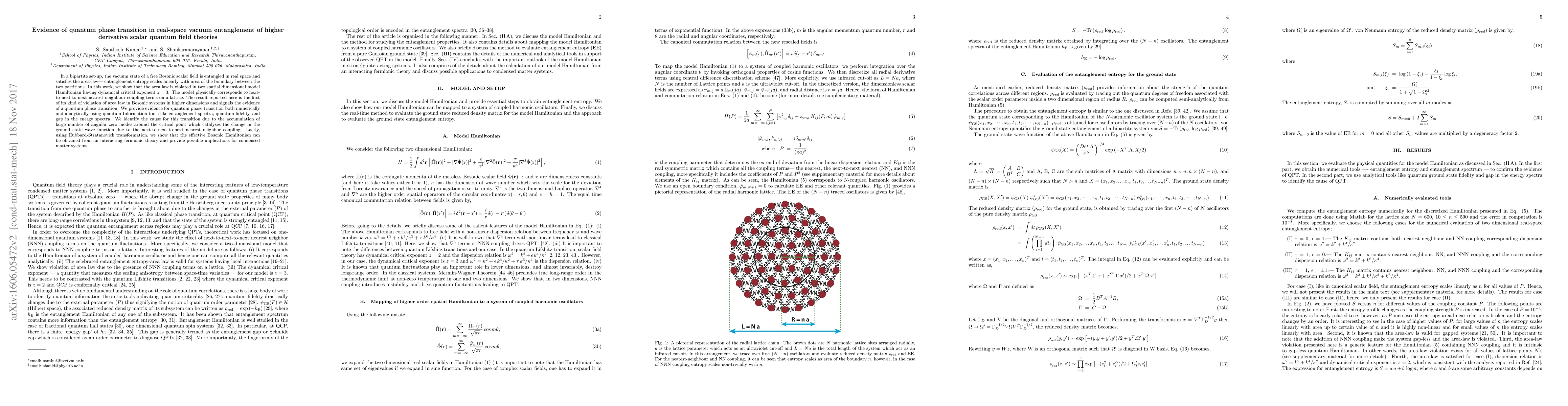 In a bipartite set-up, the vacuum state of a free Bosonic scalar field is entangled in real space and satisfies the area-law--- entanglement entropy scales linearly with area of the boundary between the two partitions. In this work, we show that the area law is violated in two spatial dimensional model Hamiltonian having dynamical critical exponent z=3. The model physically corresponds to next-to-next-to-next nearest neighbour coupling terms on a lattice. The result reported here is the first of its kind of violation of area law in Bosonic systems in higher dimensions and signals the evidence of a quantum phase transition. We provide evidence for quantum phase transition both numerically and analytically using quantum Information tools like entanglement spectra, quantum fidelity, and gap in the energy spectra. We identify the cause for this transition due to the accumulation of large number of angular zero modes around the critical point which catalyses the change in the ground state wave function due to the next-to-next-to-next nearest neighbor coupling. Lastly, using Hubbard-Stratanovich transformation, we show that the effective Bosonic Hamiltonian can be obtained from an interacting fermionic theory and provide possible implications for condensed matter systems.