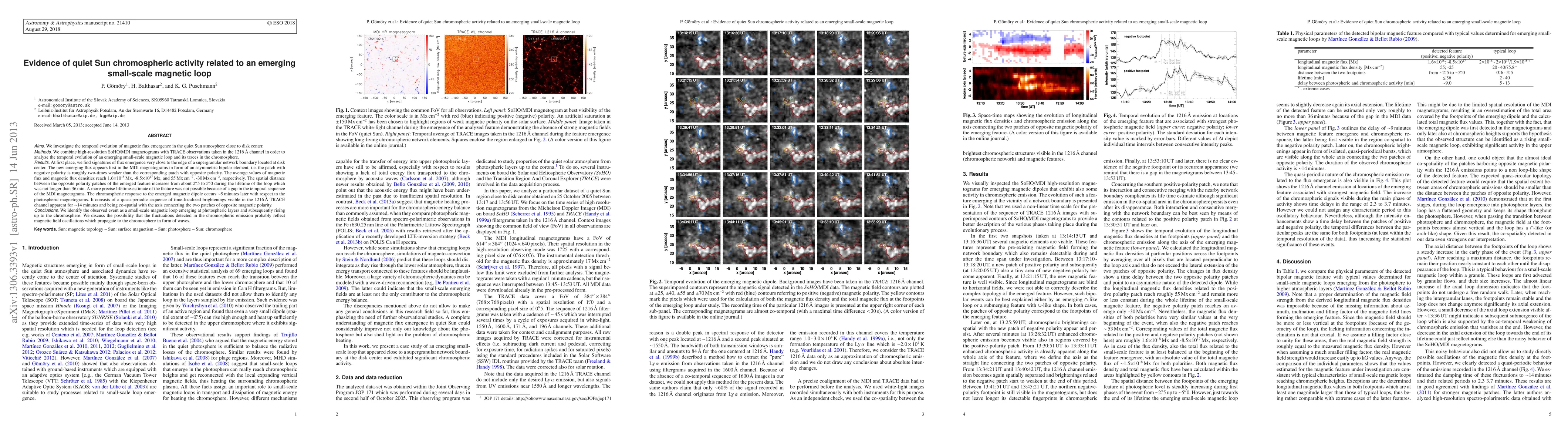 Aims: We investigate the temporal evolution of magnetic flux emergence in the quiet Sun atmosphere close to disk center. Methods: We combine high-resolution SoHO/MDI magnetograms with TRACE observations taken in the 1216 {\AA} channel in order to analyze the temporal evolution of an emerging small-scale magnetic loop and its traces in the chromosphere. Results: At first place, we find signatures of flux emergence very close to the edge of a supergranular network boundary located at disk center. The new emerging flux appears first in the MDI magnetograms in form of an asymmetric bipolar element, i.e. the patch with negative polarity is roughly two-times weaker than the corresponding patch with opposite polarity. The average values of magnetic flux and magnetic flux densities reach 1.6 x 10^18 Mx, -8.5 x 10^17 Mx, and 55 Mx cm^-2, -30 Mx cm^-2, respectively. The spatial distance between the opposite polarity patches of the emerged feature increases from about 2.5" to 5.0" during the lifetime of the loop which was not longer than 36 min. A more precise lifetime-estimate of the feature was not possible because of a gap in the temporal sequence of the MDI magnetograms. The chromospheric response to the emerged magnetic dipole occurs ~ 9 minutes later with respect to the photospheric magnetograms. It consists of a quasi-periodic sequence of time-localized brightenings visible in the 1216 {\AA} TRACE channel apparent for ~ 14 minutes and being co-spatial with the axis connecting the two patches of opposite magnetic polarity. Conclusions: We identify the observed event as a small-scale magnetic loop emerging at photospheric layers and subsequently rising up to the chromosphere. We discuss the possibility that the fluctuations detected in the chromospheric emission probably reflect magnetic field oscillations which propagate to the chromosphere in form of waves.
