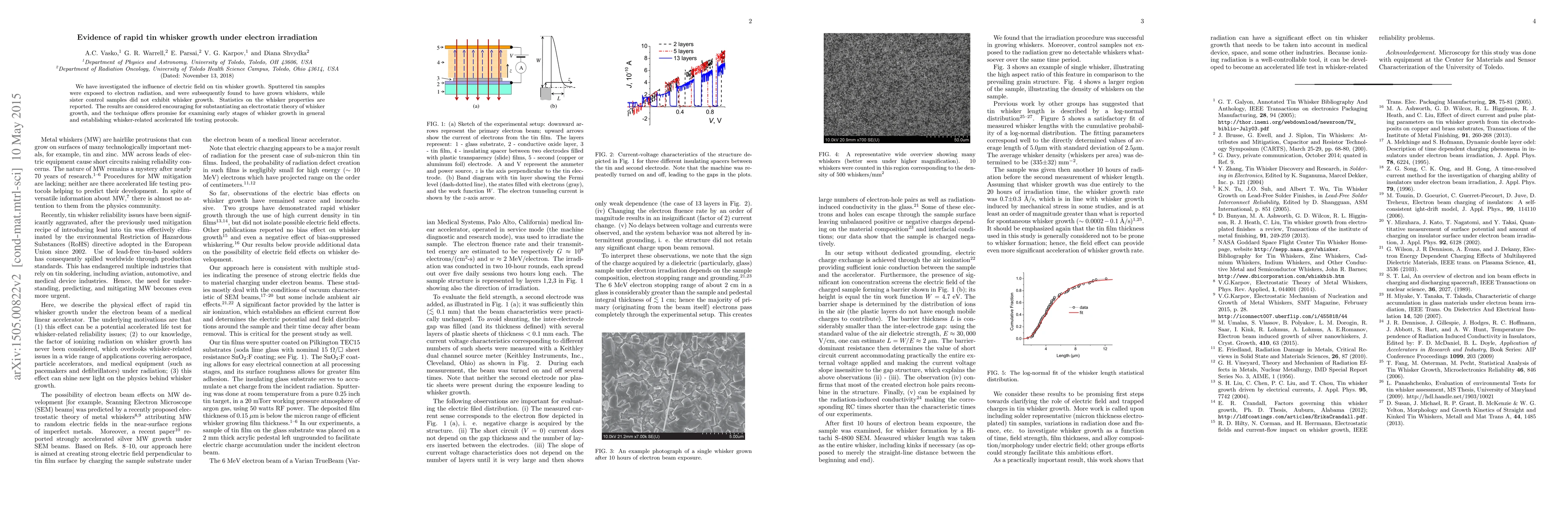 This study demonstrates that electron irradiation accelerates tin whisker growth in sputtered tin samples, while control samples without irradiation remain unaffected, supporting an electrostatic theory of whisker growth and suggesting a method for accelerated life testing.