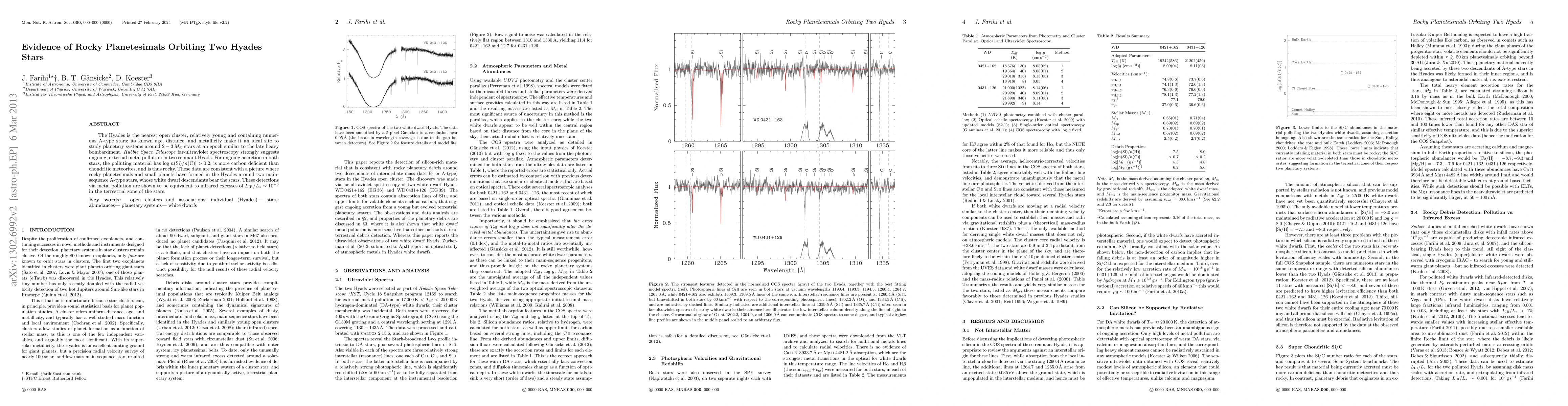 The Hyades is the nearest open cluster, relatively young and containing numerous A-type stars; its known age, distance, and metallicity make it an ideal site to study planetary systems around 2-3 Msun stars at an epoch similar to the late heavy bombardment. Hubble Space Telescope far-ultraviolet spectroscopy strongly suggests ongoing, external metal pollution in two remnant Hyads. For ongoing accretion in both stars, the polluting material has log[n(Si)/n(C)] > 0.2, is more carbon deficient than chondritic meteorites, and is thus rocky. These data are consistent with a picture where rocky planetesimals and small planets have formed in the Hyades around two main-sequence A-type stars, whose white dwarf descendants bear the scars. These detections via metal pollution are shown to be equivalent to infrared excesses of Lir/L* ~ 1e-6 in the terrestrial zone of the stars.