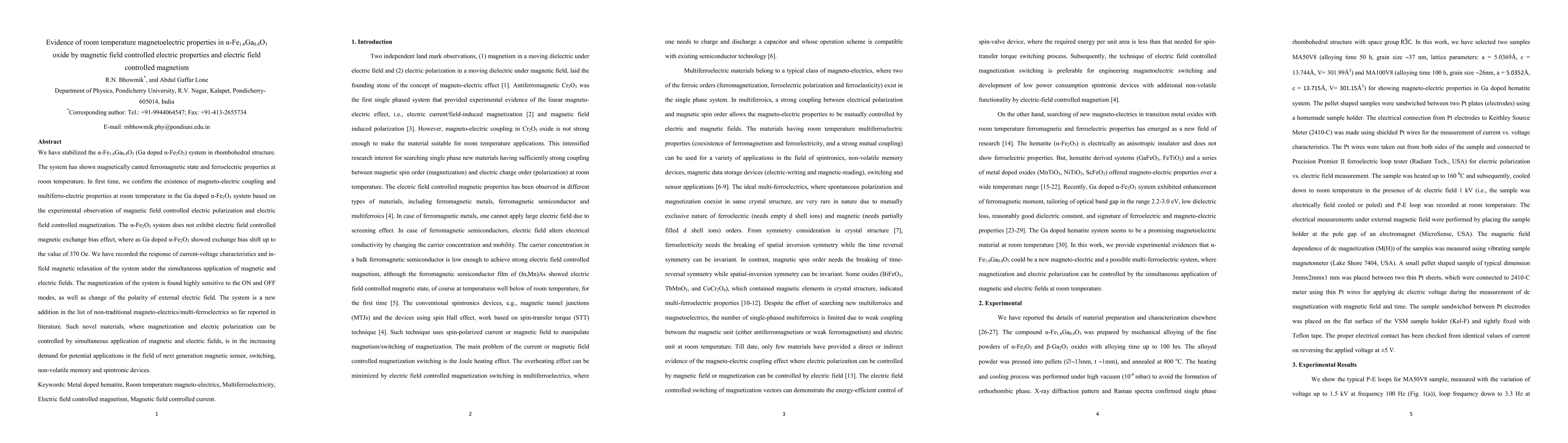 This paper reports the stabilization of Ga-doped α-Fe2O3 in a rhombohedral structure exhibiting room temperature magnetoelectric properties, including magnetic field controlled electric polarization and electric field controlled magnetization. The material shows potential for next-generation magnetic sensors and memory devices due to its unique magnetoelectric coupling and multiferroelectric behavior.
