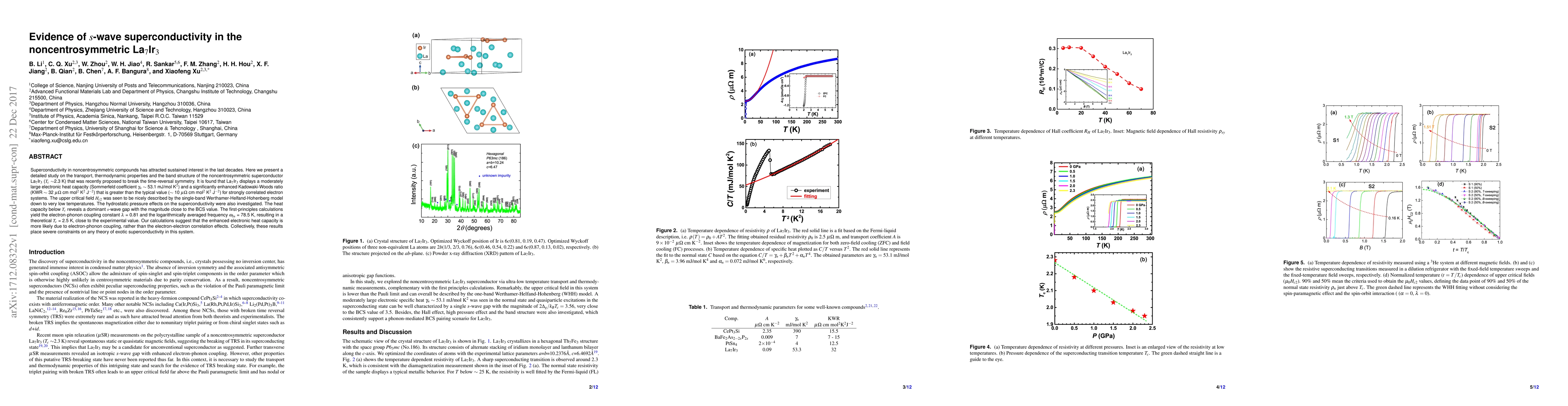 This paper investigates the superconductivity in the noncentrosymmetric compound La$_7$Ir$_3$, revealing an s-wave superconducting gap and a moderately large electronic heat capacity, suggesting electron-phonon coupling as the primary mechanism. The study also finds an enhanced Kadowaki-Woods ratio and supports the single-band Werthamer-Helfand-Hohenberg model for the upper critical field.