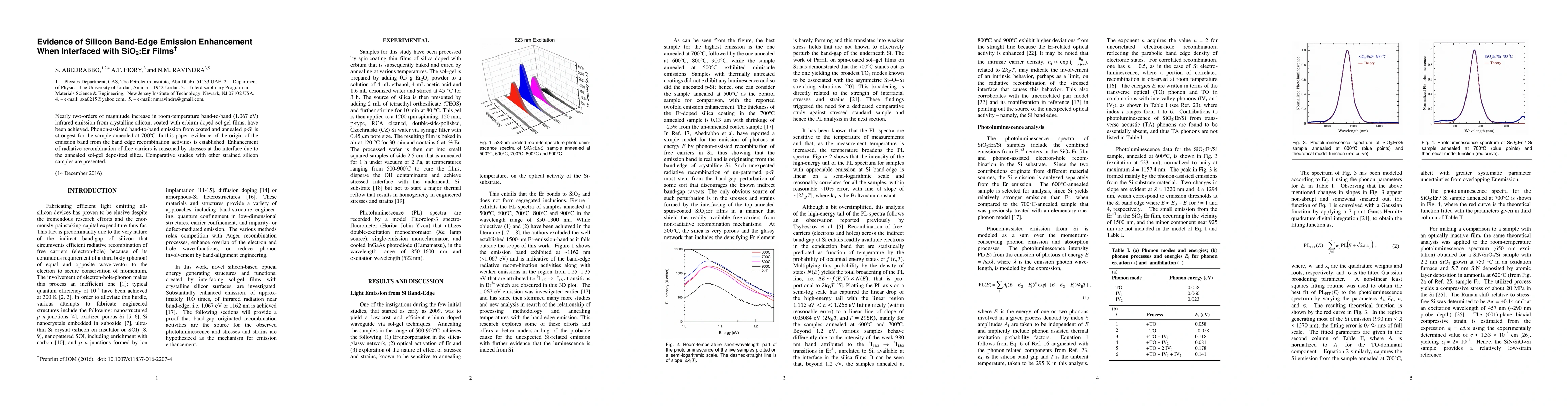 This paper reports a nearly two-orders-of-magnitude increase in room-temperature infrared emission from silicon when coated with erbium-doped sol-gel films, with the highest emission observed after annealing at 700°C. The study attributes the emission enhancement to the interface stresses caused by the annealed silica film.