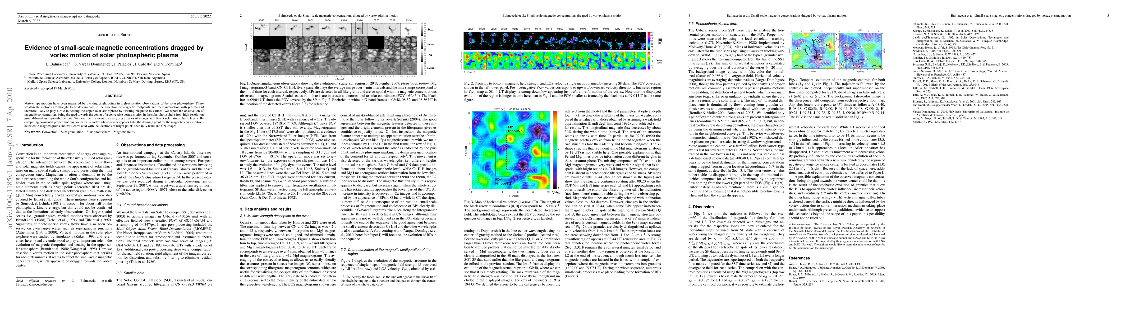 Vortex-type motions have been measured by tracking bright points in high-resolution observations of the solar photosphere. These small-scale motions are thought to be determinant in the evolution of magnetic footpoints and their interaction with plasma and therefore likely to play a role in heating the upper solar atmosphere by twisting magnetic flux tubes. We report the observation of magnetic concentrations being dragged towards the center of a convective vortex motion in the solar photosphere from high-resolution ground-based and space-borne data. We describe this event by analyzing a series of images at different solar atmospheric layers. By computing horizontal proper motions, we detect a vortex whose center appears to be the draining point for the magnetic concentrations detected in magnetograms and well-correlated with the locations of bright points seen in G-band and CN images.