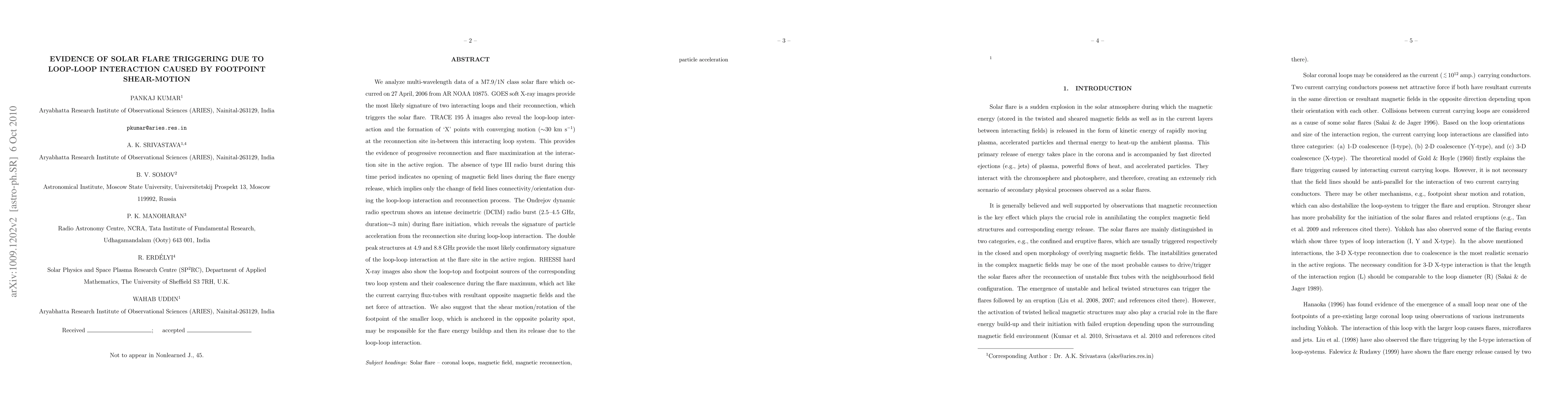 We analyze multi-wavelength data of a M7.9/1N class solar flare which occurred on 27 April, 2006 from AR NOAA 10875. GOES soft X-ray images provide the most likely signature of two interacting loops and their reconnection, which triggers the solar flare. TRACE 195 A images also reveal the loop-loop interaction and the formation of `X' points with converging motion (~30 km/s) at the reconnection site in-between this interacting loop system. This provides the evidence of progressive reconnection and flare maximization at the interaction site in the active region. The absence of type III radio burst during this time period indicates no opening of magnetic field lines during the flare energy release, which implies only the change of field lines connectivity/orientation during the loop-loop interaction and reconnection process. The Ondrejov dynamic radio spectrum shows an intense decimetric (DCIM) radio burst (2.5--4.5 GHz, duration ~3 min) during flare initiation, which reveals the signature of particle acceleration from the reconnection site during loop-loop interaction. The double peak structures at 4.9 and 8.8 GHz provide the most likely confirmatory signature of the loop-loop interaction at the flare site in the active region. RHESSI hard X-ray images also show the loop-top and footpoint sources of the corresponding two loop system and their coalescence during the flare maximum, which act like the current carrying flux-tubes with resultant opposite magnetic fields and the net force of attraction. We also suggest that the shear motion/rotation of the footpoint of the smaller loop, which is anchored in the opposite polarity spot, may be responsible for the flare energy buildup and then its release due to the loop-loop interaction.