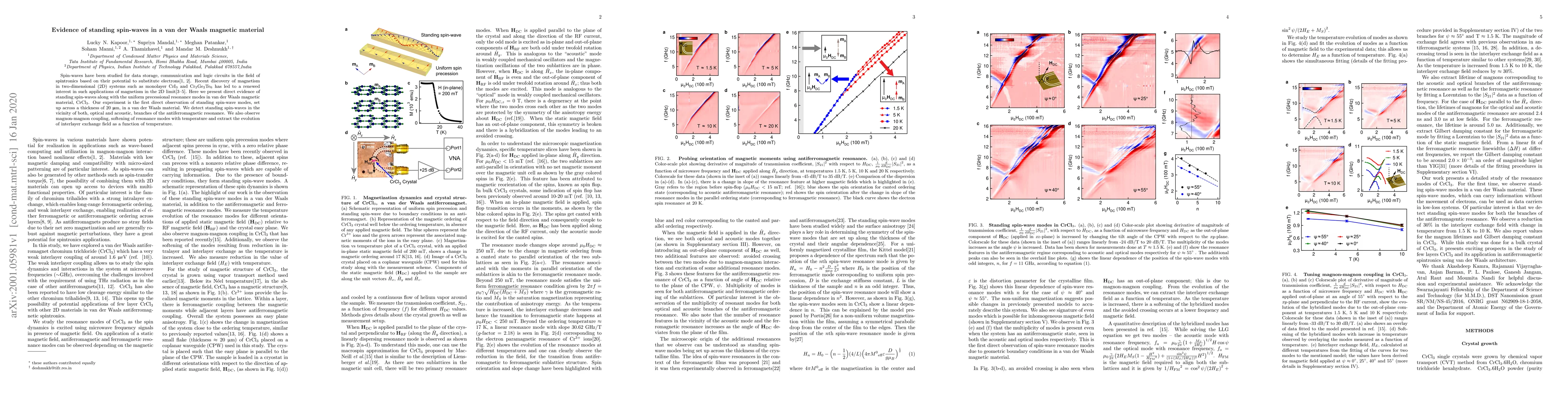 Spin-waves have been studied for data storage, communication and logic circuits in the field of spintronics based on their potential to substitute electrons. Recent discovery of magnetism in two-dimensional (2D) systems such as monolayer CrI$_3$ and Cr$_2$Ge$_2$Te$_6$ has led to a renewed interest in such applications of magnetism in the 2D limit. Here we present direct evidence of standing spin-waves along with the uniform precessional resonance modes in van der Waals magnetic material, CrCl$_3$. Our experiment is the first direct observation of standing spin-wave modes, set up across a thickness of 20 $\mu$m, in a van der Waals material. We detect standing spin-waves in the vicinity of both, optical and acoustic, branches of the antiferromagnetic resonance. We also observe magnon-magnon coupling, softening of resonance modes with temperature and extract the evolution of interlayer exchange field as a function of temperature.