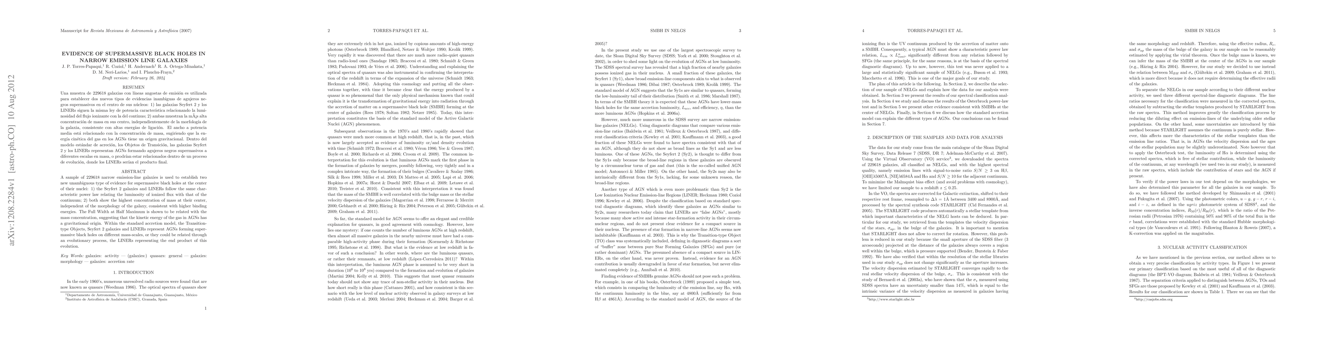 This study provides strong evidence for supermassive black holes in the nuclei of narrow emission-line galaxies through two key findings: the correlation between luminosity of ionized flux and continuum, and the highest mass concentration at the center. The results suggest these galaxies may evolve through an accretion process, with LINERs representing the end stage.