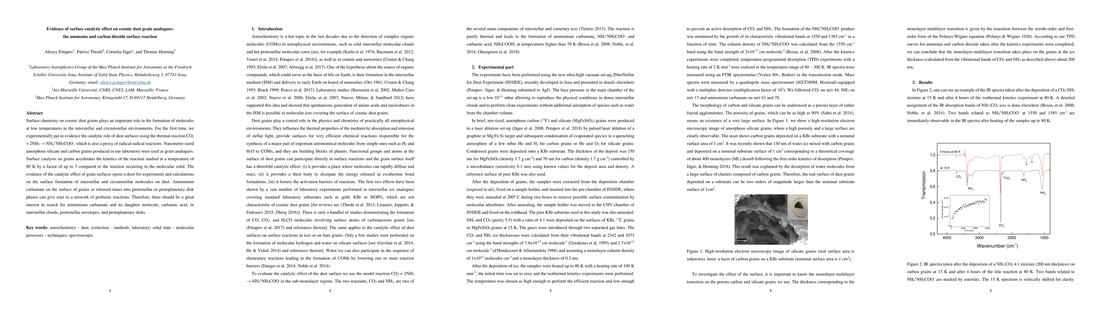 This study experimentally demonstrates the catalytic effect of cosmic dust grain surfaces on the reaction CO2 + 2NH3, showing a significant acceleration of the reaction kinetics at 80 K. The findings suggest a potential role for dust grains in initiating prebiotic reactions in interstellar and circumstellar environments.